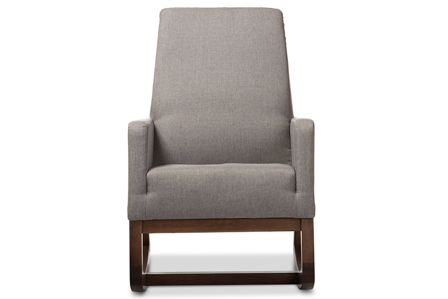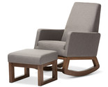 Inspired by mid-century modern design, the Roana Rocking Chair and Ottoman Set has blended the retro feel of a vintage upholstered rocking chair with the quality, made-to-last design you'd expect from a modern piece of furniture. The result is our exclusive Roana Rocking Chair and Ottoman Set. Featuring polyester fabric in Grayand a sturdy wood frame in a beautiful walnut finishing, this retro chair set feels right at home in a nursery, living room or any shared space. High back contoured design and ergonomic arm height add more charms to this piece. The Roana looks smart, modern, but comfortable can be a good rocking chair set for nursery during middle of the night feedings and yet a pretty piece of furniture to accent the room. Made in Malaysia, the Roana requires assembly.