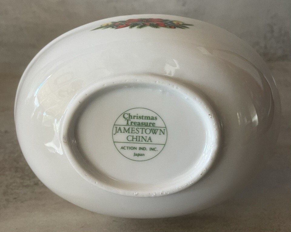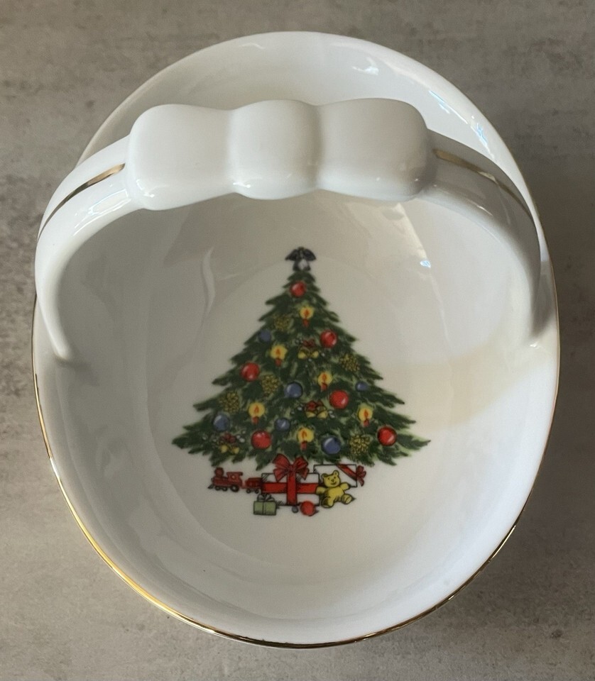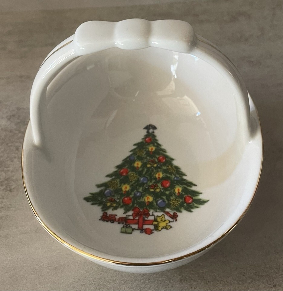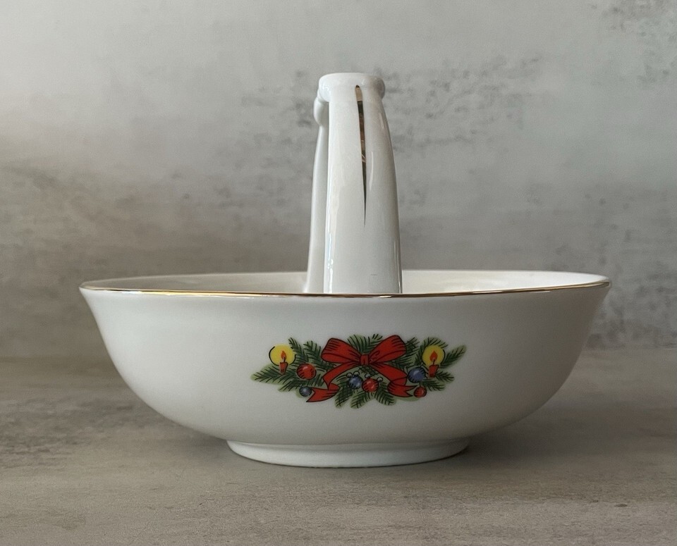 Vintage Jamestown China Christmas Treasure handled porcelain basket, featuring a Christmas tree and holly berry design with hand-painted 24K gold trim. Perfect as a holiday candy dish, trinket bowl, decor centerpiece, or collector gift. Comes in original retail box.