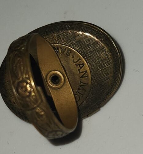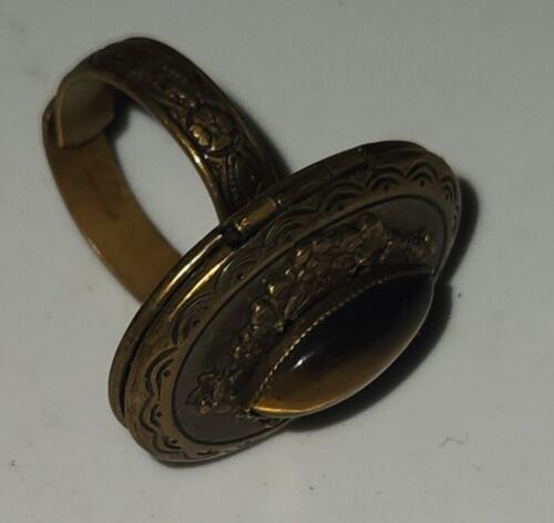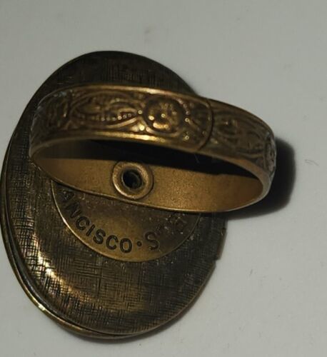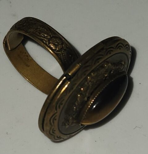 This Jan Michaels San Francisco ring is a vintage piece of jewelry that would be a great addition to any collection. The adjustable bronze tone ring features a unique tiger eye stone and even has a picture holder feature. Perfect for those who love vintage and antique jewelry, or those who appreciate a unique and one-of-a-kind piece. The ring is made by Jan Michaels and has been well-preserved, ready for its new owner.