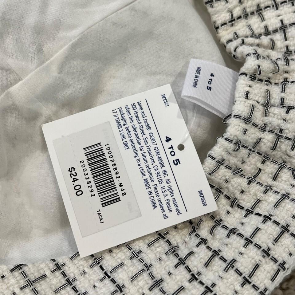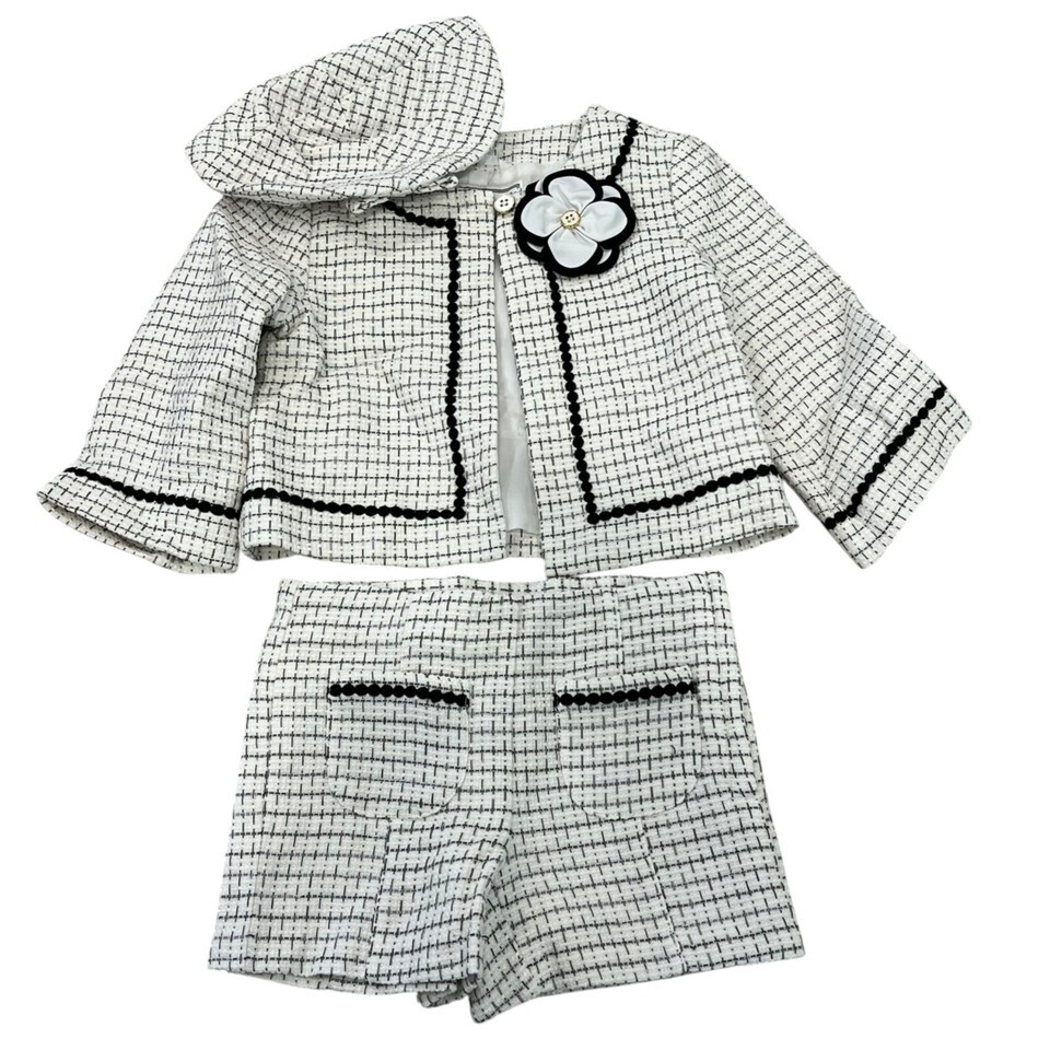 This chic Jackie O style ensemble from Janie and Jack includes a jacket, shorts, and a beret hat, perfect for stylish kids. Ideal for special occasions or dress-up play, this outfit offers a timeless look with a modern twist.
