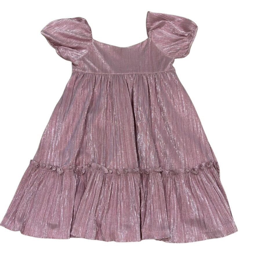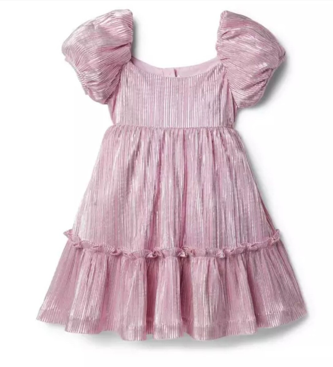 Let the little girl shine in this metallic plisse dress. With details like puff sleeves and a little ruffle trim on the skirt.