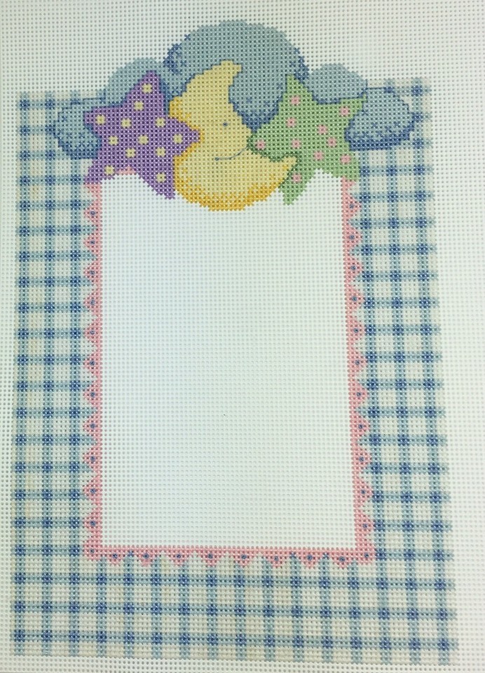 Blue and white on the outer frame with a pink triangle design outlining the picture. A blue cloud wraps around the yellow moon and purple and green stars with yellow polka dots. Very sweet!