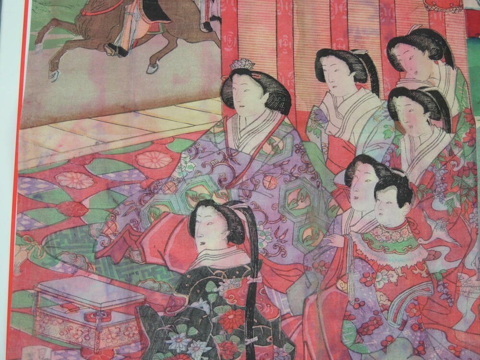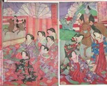 - Japanese Paintings 14"x9.25" Noble Horseman & Women fiber paper / cloth Antique