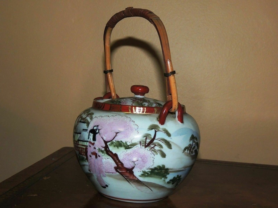 - Japanese Porcelain 5" Teapot Tea Giesha Mimosa Tree Mount Fuji Vintage Antique
