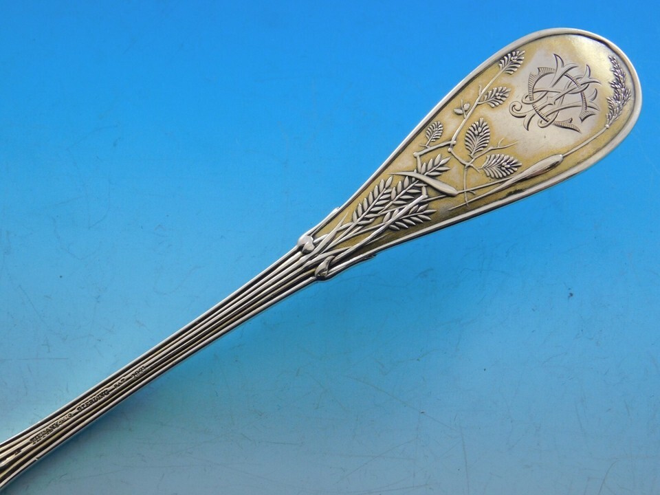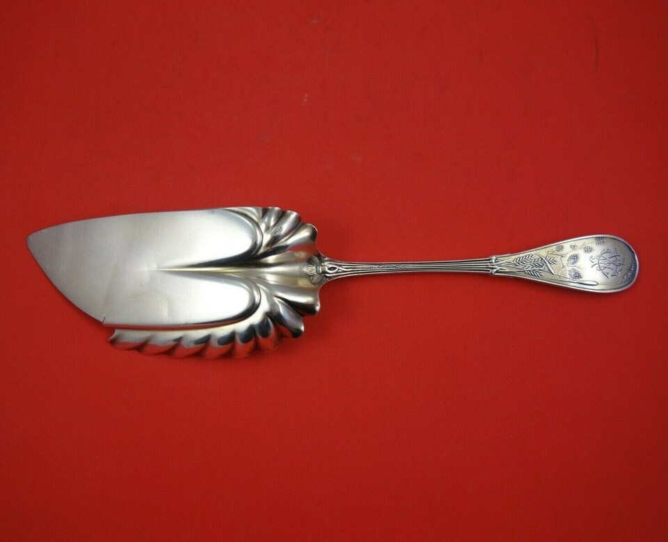 Sterling silver Fish Server Bright-Cut with Geometric Design on Blade 11 1/2" in the multi-motif pattern Japanese by Tiffany and Co. It is monogrammed on the reverse and is in fair condition with a small crack in the top corner of the blade.