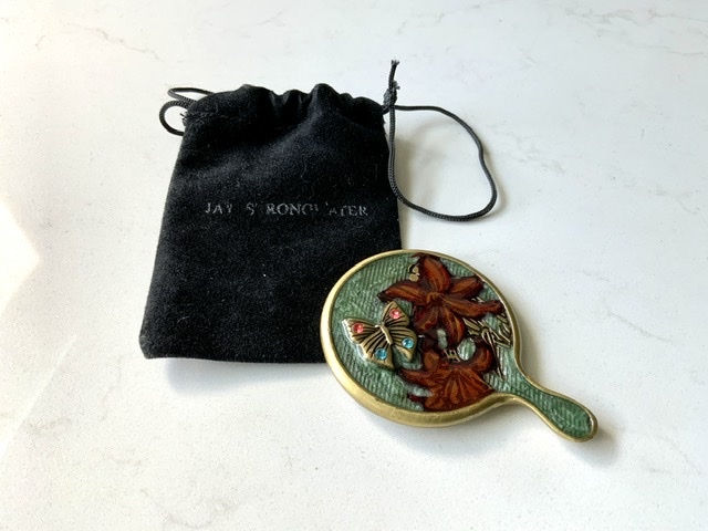 - Jay Strongwater pocket mirror with pouch, butterfly and lilies design