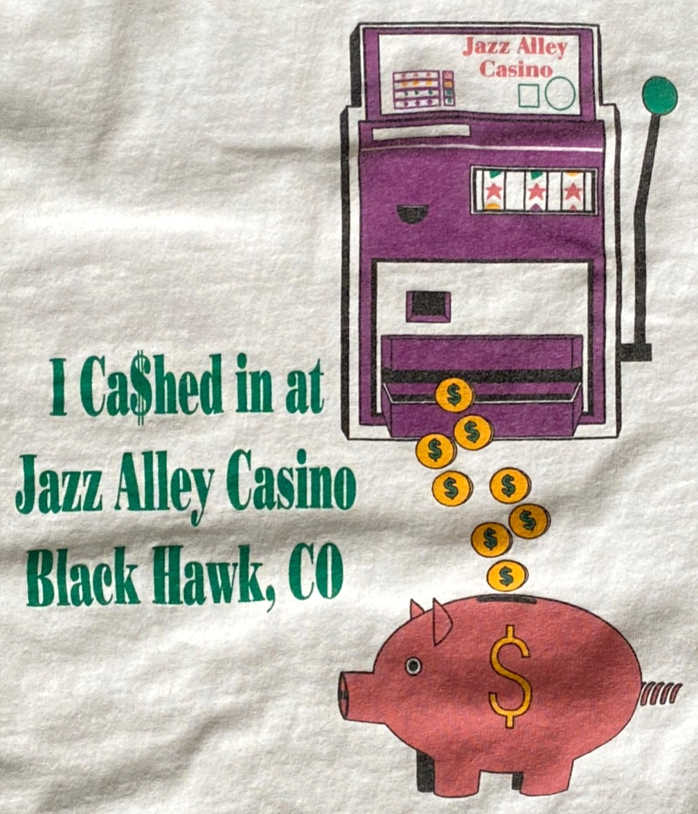 - Jazz Alley Casino T Shirt Slot Machine Piggy Bank White 90s Vtg XL Black Hawk CO