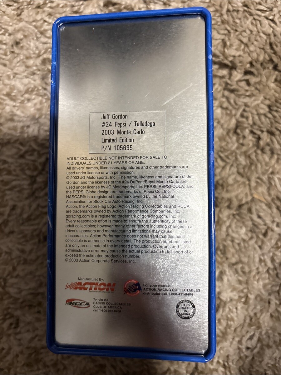 The Jeff Gordon No. 24 Pepsi/Shards 2004 Monte Carlo 1:64 Elite Die Cast Car is a limited edition collectible featuring the iconic Chevrolet vehicle driven by Jeff Gordon during the 2004 NASCAR season. This highly detailed diecast car, part of the Action Racing Collectables brand, is adorned with multi-color representations of the Pepsi/Shards schemes. It comes with a display case and personal number plate, making it a must-have for fans of racing and Jeff Gordon alike. This Elite model is a valuable addition to any diecast car collection, particularly for those who appreciate the history and significance of each race series and advertising specimen.