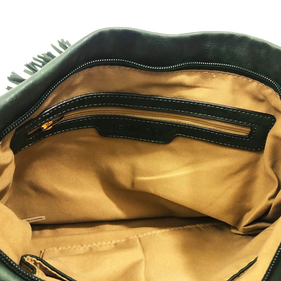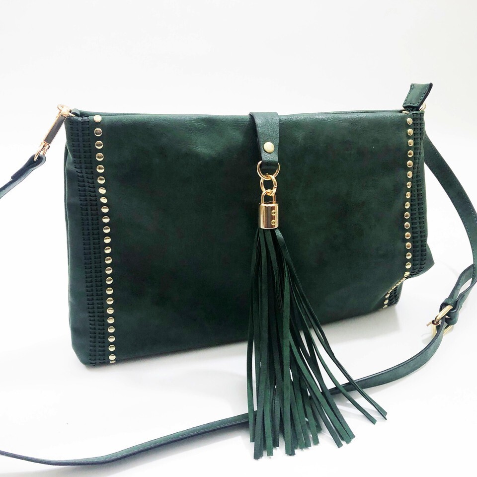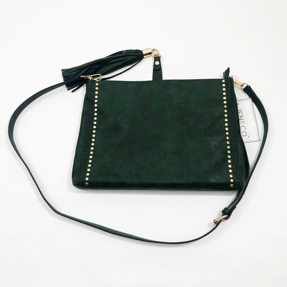 NWT, New With Tags. Jen Co. Marie, trendy style that combines fashion and functionality seamlessly. Adorned with a fold over long tassel and studded details, this bag exudes contemporary charm. The adjustable and detachable shoulder strap offers versatility in wear, allowing you to customize your look effortlessly. Inside, you'll find 2 open pockets and 1 zipper pocket, providing convenient storage for your essentials . Additionally, there's a back pocket for quick access to items. The bag zips closed securely ensuring the safety of your belongings. With dimensions measuring 13"L x 9.5"H x 2.5:D, it's the perfect accessory for any occasion. Trendy design with foldover long tassel and studded details for added charm Adjustable and detachable shoulder strap offer versatile wear options. 2 open pockets and 1 zipper pocket inside for convenient organization Back pocket provides quick access to essentials Secure zipper closure ensures the safety of your belongings Brand Jen Co Green Model Marie Designed in the USA Made in China 13x9.5x2.5 inches Adjustable cross body strap Strap is removable Tassel fold over to front side of gag Zipper closure Removable shoulder and cross body strap- Carry as a shoulder bag -cross body- or as a cluch SKU AAA-10-06-24-019 Yes, we combine orders for shipping whenever possible. If did not combine the shipping on your order correctly when we combine the items and check the shipping, if it is less than the shipping charges that you paid, we will issue you a refund for the difference.