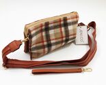 Jen Co. New with tags sales sample model Izzy plaid cross body or wristlet clutch bag. This model Izzy has beautiful fall colors of brown, rust, white, and tan. It's crafted from fabric and accented with vegan leather for a responsible, yet luxurious finish. This Izzy plaid crossbody isn't just a bag; it's a versatile companion ready to make a statement with any ensemble.