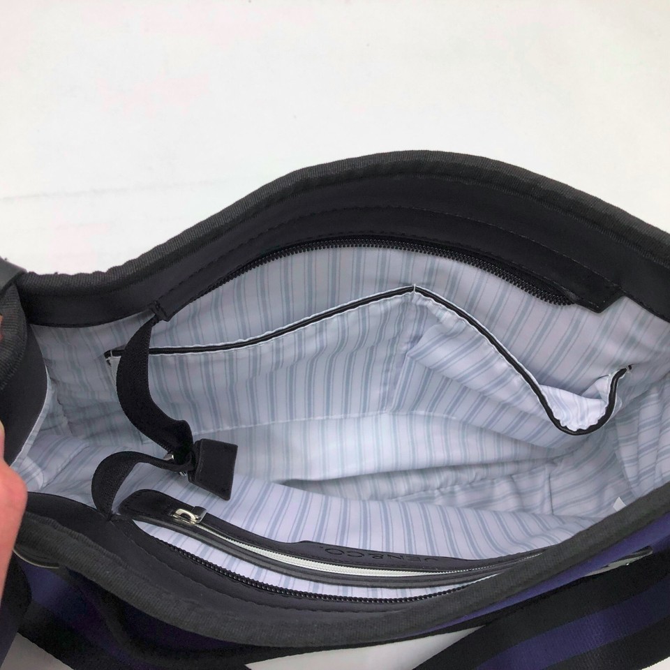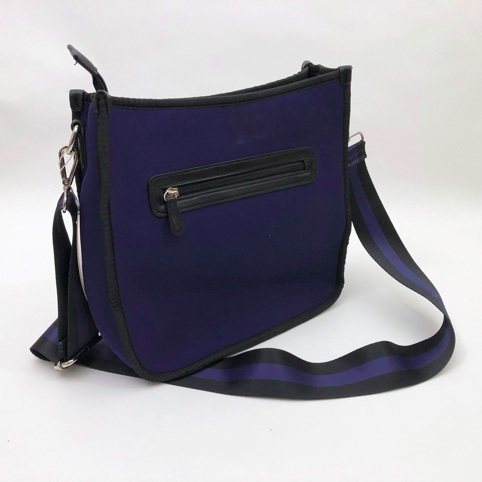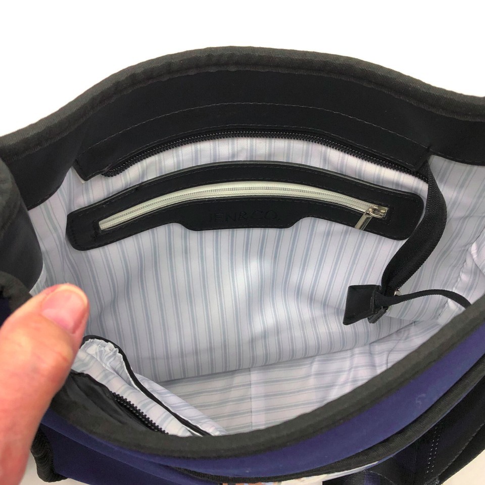 NWT, New With Tags, Jen Co. Jolee Neoprene cross body bag with adjustable removable strap. Dark boho blue with abstract print. On one side there is large pocket that closes with a magnetic snap and on the other side there is a smaller zipper pocket. Inside there are 2 slip in pockets and 1 zipper pocket. See the pictures. The Blue and black strap is adjustable and removable. You will love the space both inside and out! And the style of this easy to care for cross body bag.