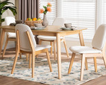Features: Premium Boucle Upholstery: Attached cushions wrapped in sumptuous boucle fabric for a cozy and contemporary aesthetic Durable Construction: Constructed from Solid Rubberwood and Engineered Wood Flowing Geometry: The bent seat and rounded backrest of the chairs promote a relaxed posture Refined Footprint: Uncluttered design ideal for smaller dining spaces or nooks with its space-saving outline Broad Rectangular Tabletop: The table features a broad rectangular tabletop with crisp lines and angles to adeptly anchor the set Streamlined Mid-Century Silhouette: Tapered posts and clean contours lend the charm of timeless artistry Set Includes: One (1) Dining Table; Four (4) Dining Chairs