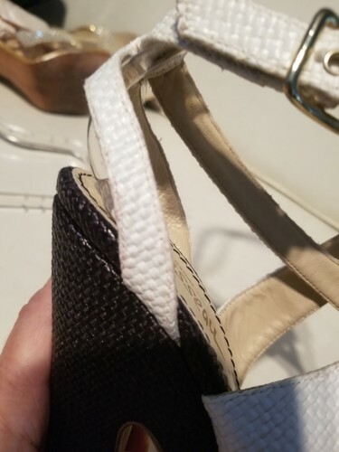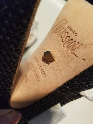 The Jerome C. Rousseau Daho Straw Platform Sandal is a stylish and unique shoe perfect for formal occasions like weddings and parties. With an ultra-high 5 3/4 inch heel and adjustable ankle strap, this vintage-inspired sandal features a black and white color scheme with a straw upper and leather lining. Made in Italy, the Daho model exudes a bohemian vibe with elements of garden and tiki themes, making it a standout choice for the fashion-forward woman looking to make a statement. There is some light pink transfer from sleeper bag. You will get the bag, but I recommend wrapping the shoes kn something else if you use it. I use recycled materials for packaging whenever possible. Stackds Please ask questions as all sales are final.