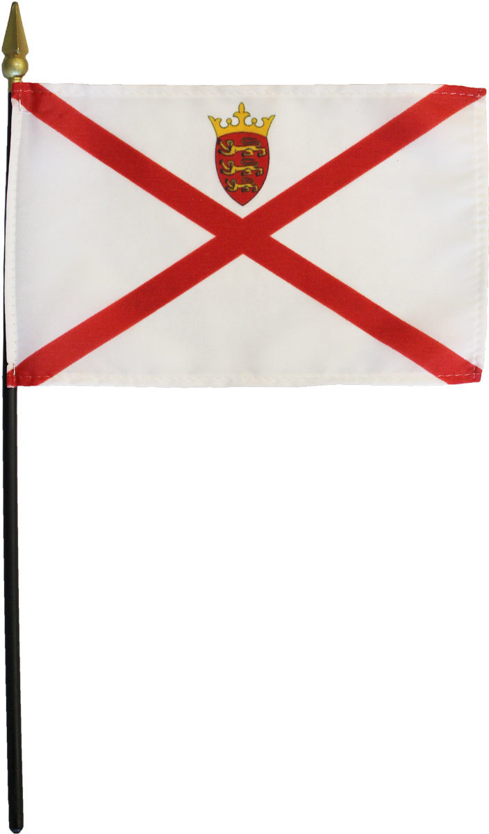These beautiful 4" x 6" Jersey stickflags are crafted with intricate designs and screen-printed in a full range of bright, durable colors, attached to a small 10" plastic staff. The authentic designs are based on information from official sources. Bases are available for these stick flags in our ACCESSORIES section. Jersey, officially theBailiwick of Jersey,is a BritishCrown dependencyjust off the coast ofNormandy,France.
