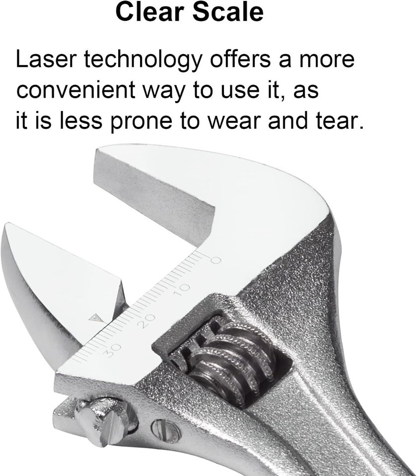 LASER PRINTED SCALE - Easily measure nut/bolt size at the jaw of the wrench.
