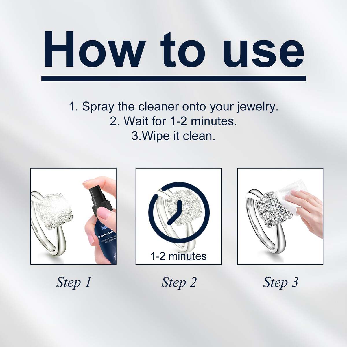 Our jewelry cleaners contain surfactants. It can make gold and silver jewelry whiter, clean, and has a strong cleaning effect. The way it works is simple:1. Spray the cleaner on the jewelry. 2. Wait 1-2 minutes. 3. Wipe clean. And it can deeply clean your jewelry without damaging it, while also forming a protective film that restores the shine of your jewelry.