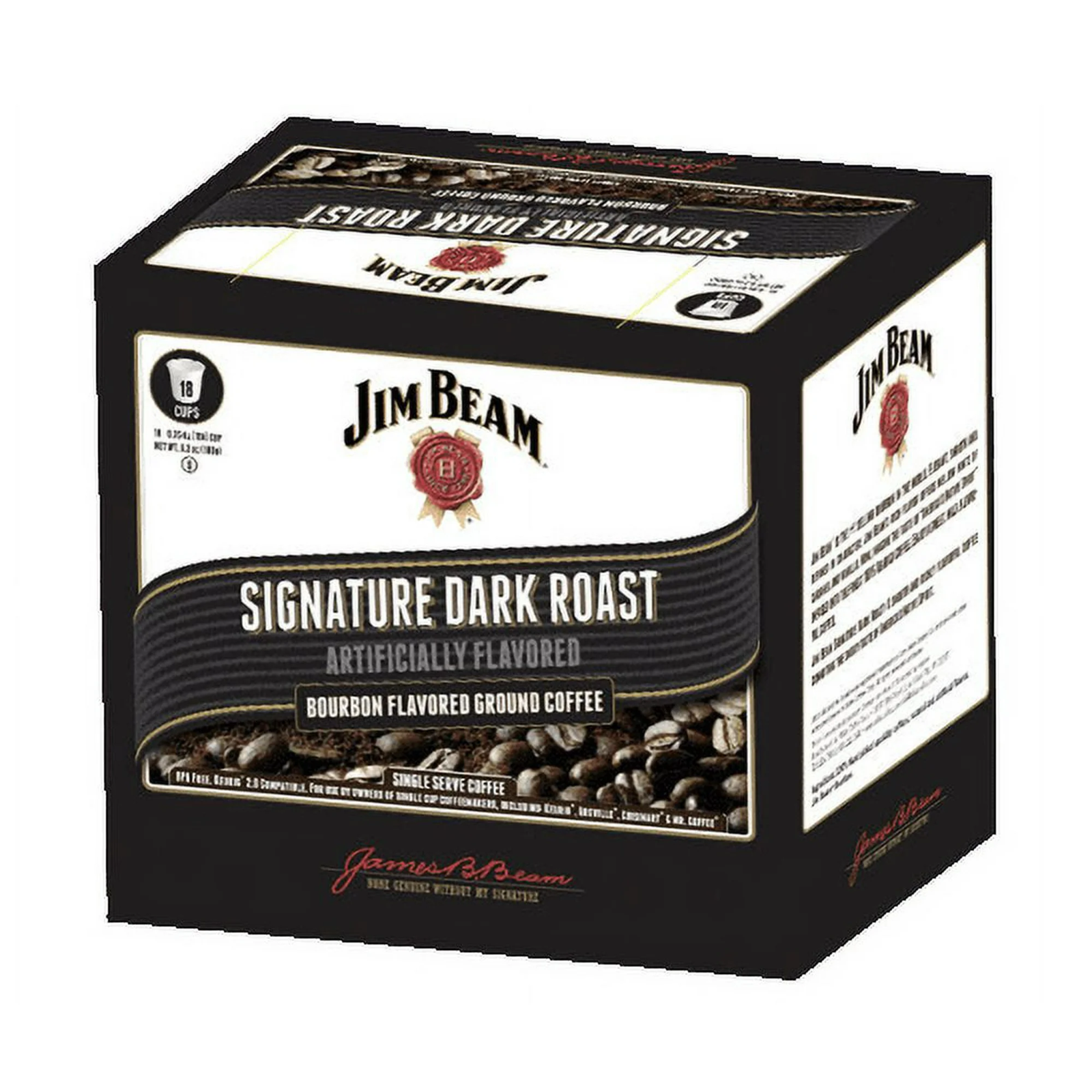 Discover Jim Beam Bourbon Flavored Coffee in two delicious varieties ? Signature Dark Roast and Spiced Honey. Enjoy the rich flavor of America's Native Spirit infused into 100% Arabica coffee. USDA Organic, Keurig Compatible, Non-Alcoholic.