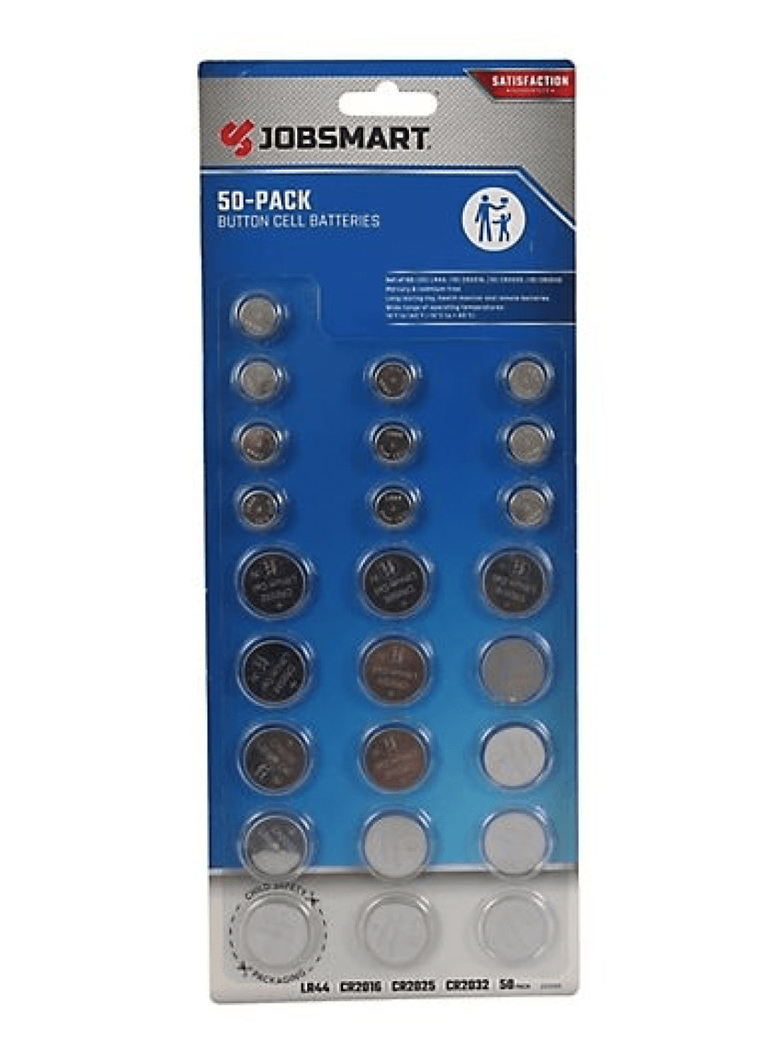 - JobSmart BC50 Assorted Button Cell Batteries LR44, CR2016, CR2025, CR2032, 50-Pc