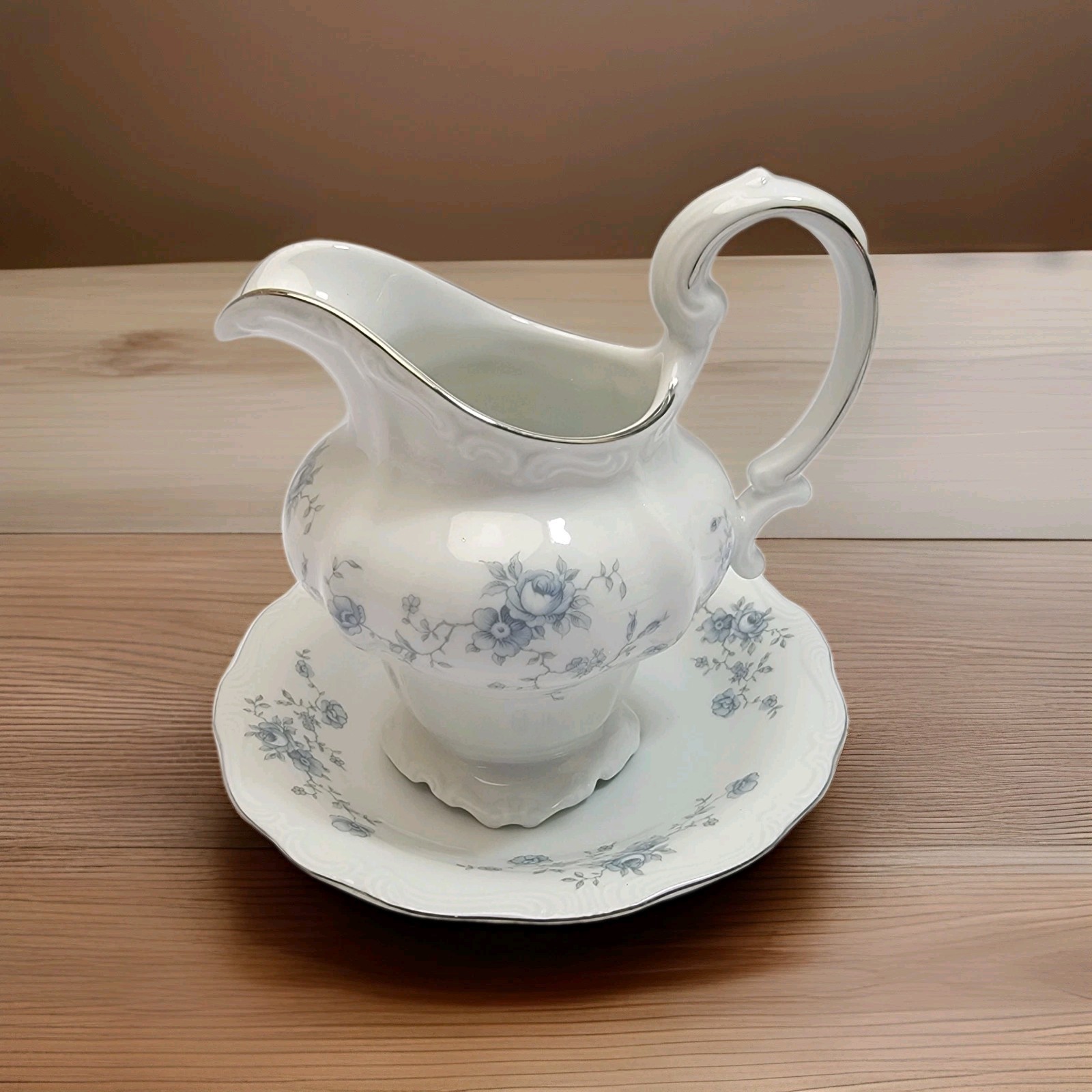 The product is a vintage creamer and saucer witj platinum trim, featuring a beautiful blue garland pattern in porcelain china. painted with a glossy finish, this Victorian-style creamer is a charming addition to any table setting. Made in Bavaria, Germany by the renowned Haviland brand, this art pottery piece exudes elegance and sophistication. Perfect for serving cream in style, this creamer and saucer set is a timeless and luxurious collectible for any collector of fine dinnerware.