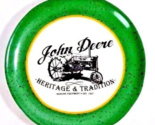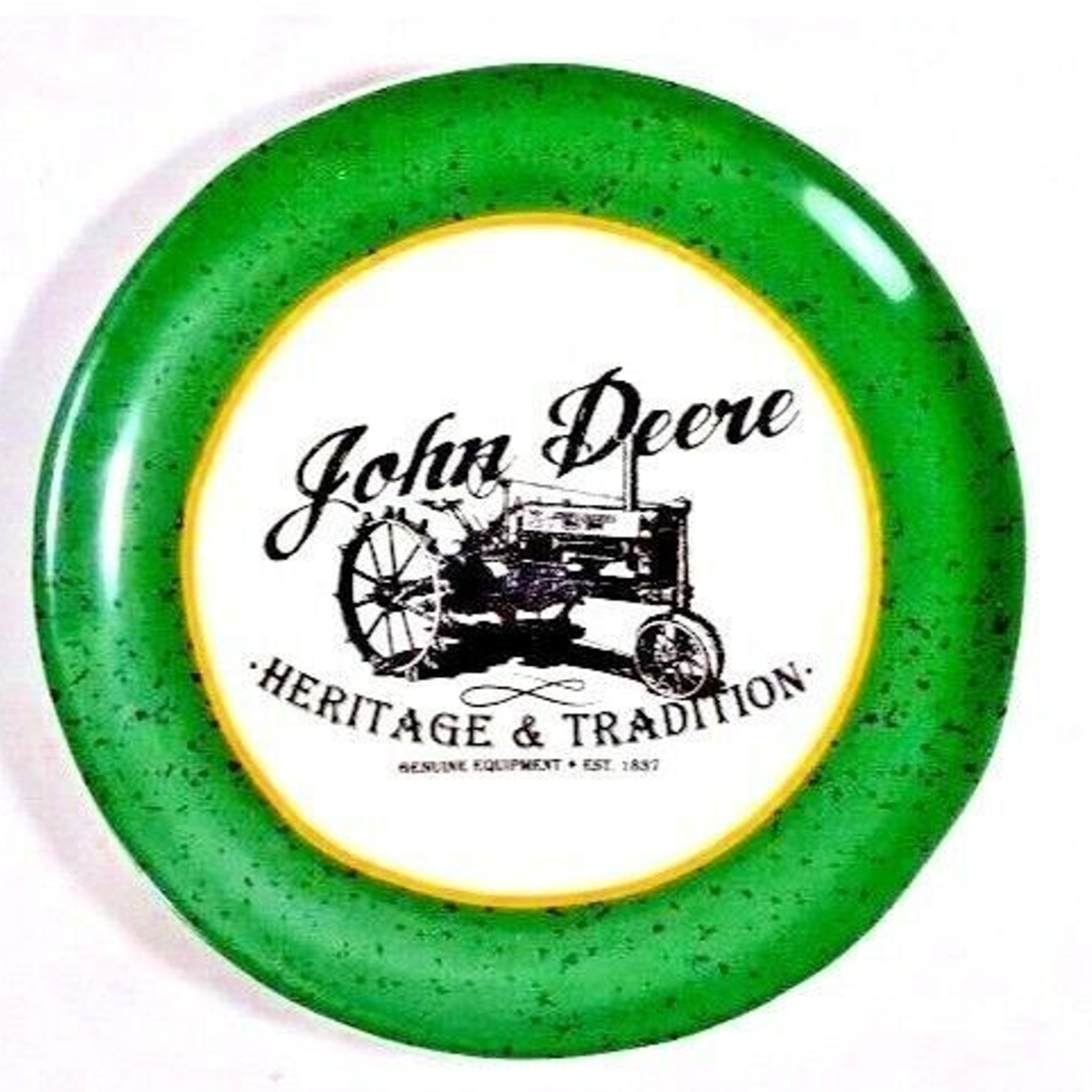 John Deere salad or dessert plate featuring a tractor with the text "JOHN DEERE Heritage Tradition, Genuine Equipment, Est 1837".
