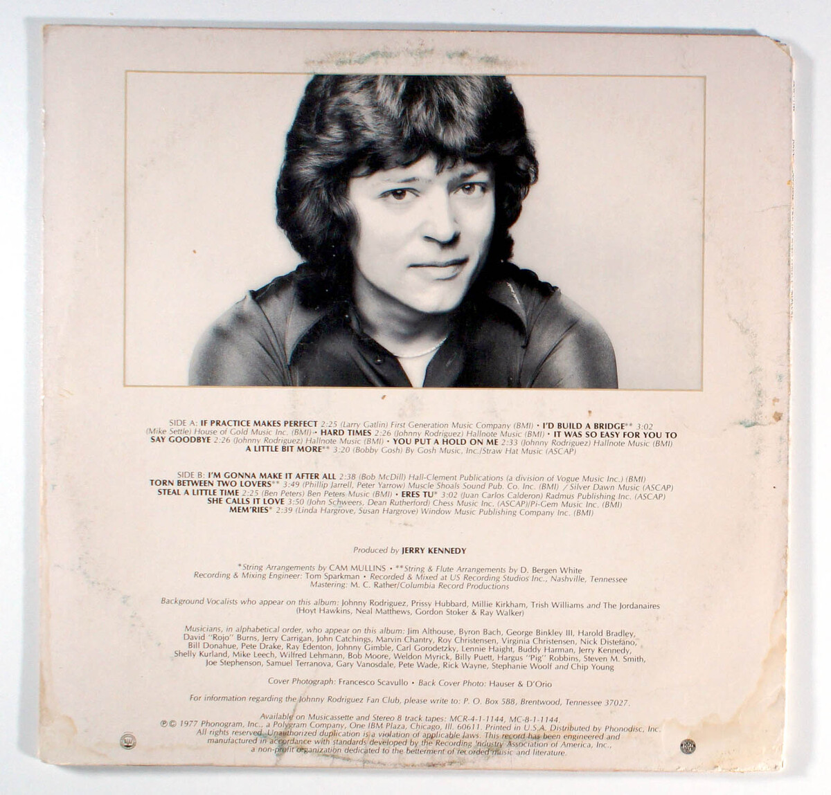 Practice Makes Perfect, by country music artist Johnny Rodriguez, was released during the peak of his 1970s success. Rodriguez, one of the first prominent Mexican-American stars in mainstream country, was discovered by Bobby Bare while incarcerated in a Texas prison, marking a historically significant breakthrough in breaking racial barriers in Nashville. Produced by Jerry Kennedy, the album mixes honky-tonk traditions with pop-country crossover elements, including bilingual tracks like the Spanish Eres Tu and the cover of Torn Between Two Lovers, reflecting the genre's evolving inclusivity. It captures Rodriguez's smooth vocals and storytelling during a transformative era for country music's diversification. The album's major hit single, the Larry Gatlin-penned If Practice Makes Perfect, reached No. 5 on the Billboard Hot Country Songs chart in 1977, one of his final Top 10 successes.