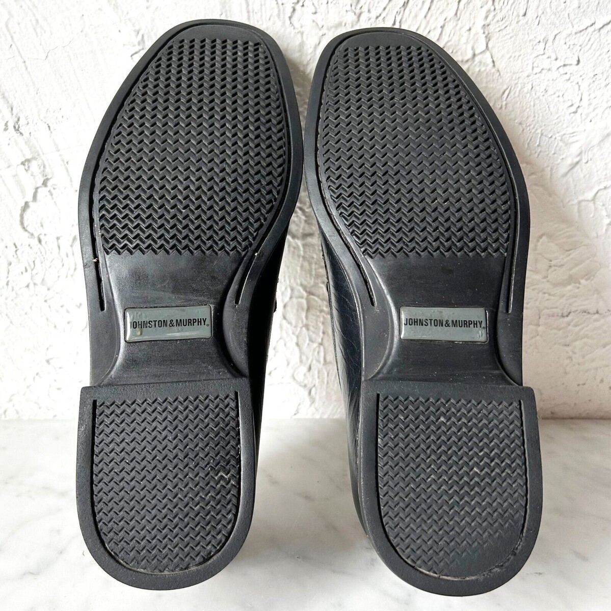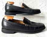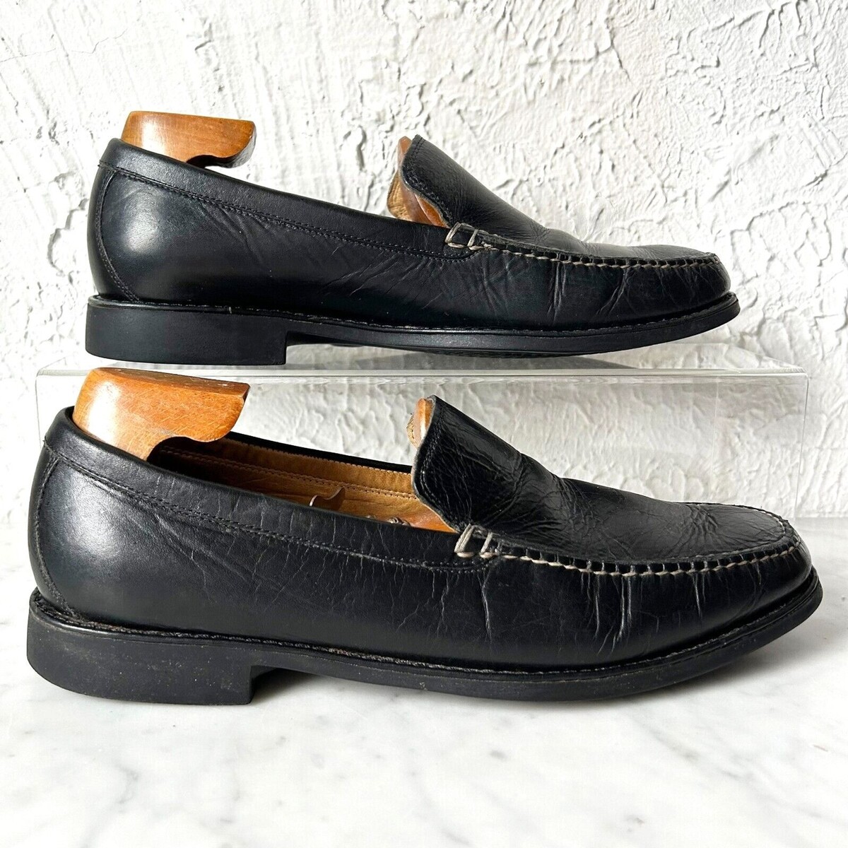 Johnston Murphy men's size 9-1/2 M Ainsworth Venetian loafers are in excellent condition with normal wear. Black leather upper with supple sheepskin lining. Cushioned insole. Rubber sole and heel. Shoe trees not included.