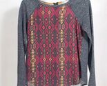 EUC Jolt long sleeve burgundy, gold, black with heathered gray sleeves top has a striking tribal boho pattern on the front. This striking top has a rounded hemline and has a metal zipper. This will make an eye catching statement when paired with jeans or slacks. No rips, stains, or tears.