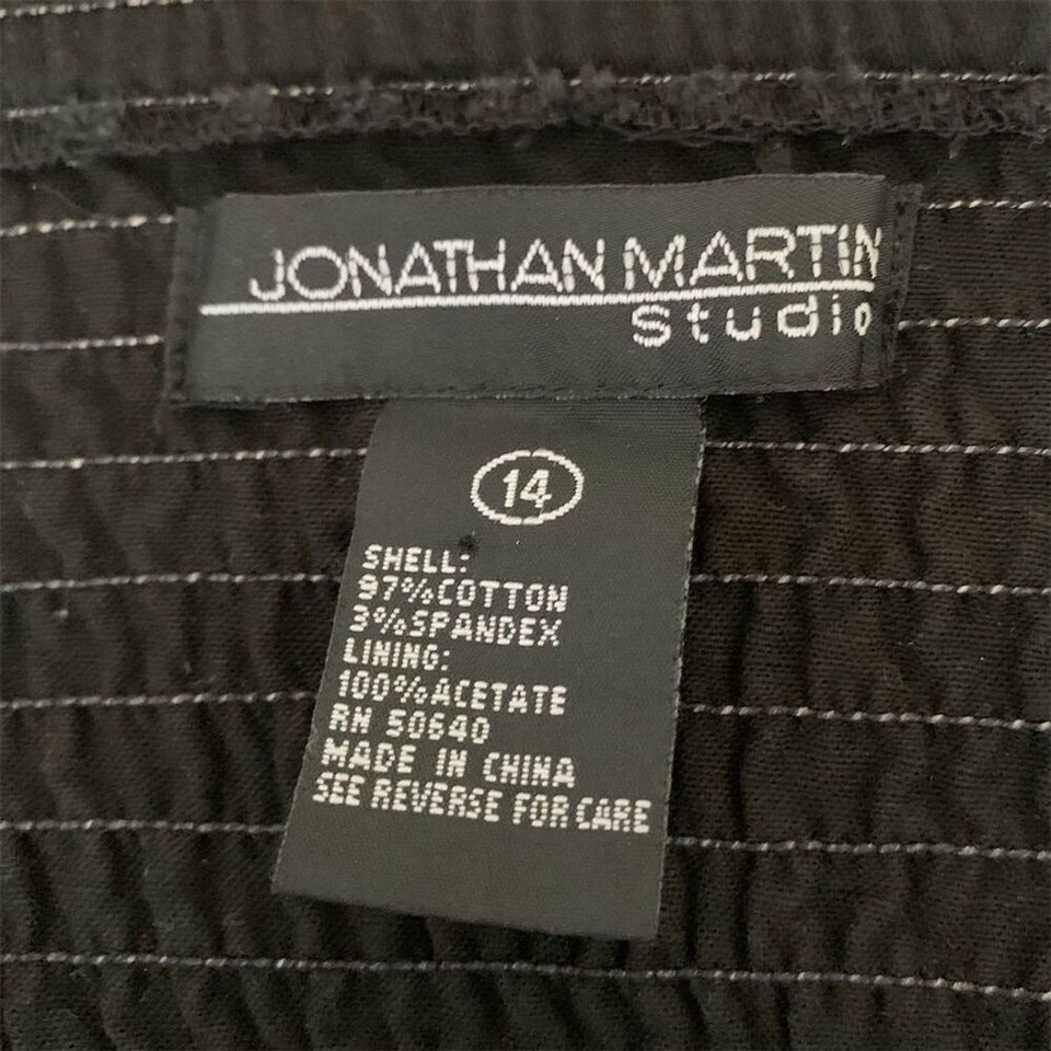 Jonathan Martin Studio women's dress in size 14, regular fit. This black A-line dress features a halter neckline and knee-length design. Made from 97% cotton, 3% spandex, and 100% acetate, it is machine washable. Pre-owned. Keywords: Jonathan Martin Studio, women's dress, size 14, black dress, A-line, halter neckline, knee-length, cotton dress, spandex, acetate, machine washable, pre-owned, women's fashion, regular fit.