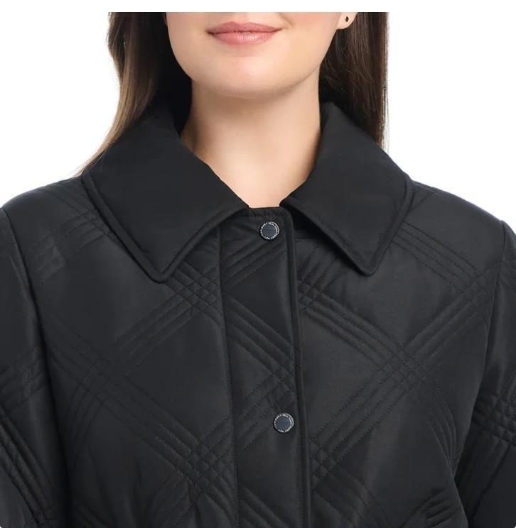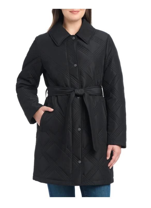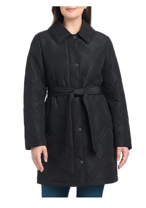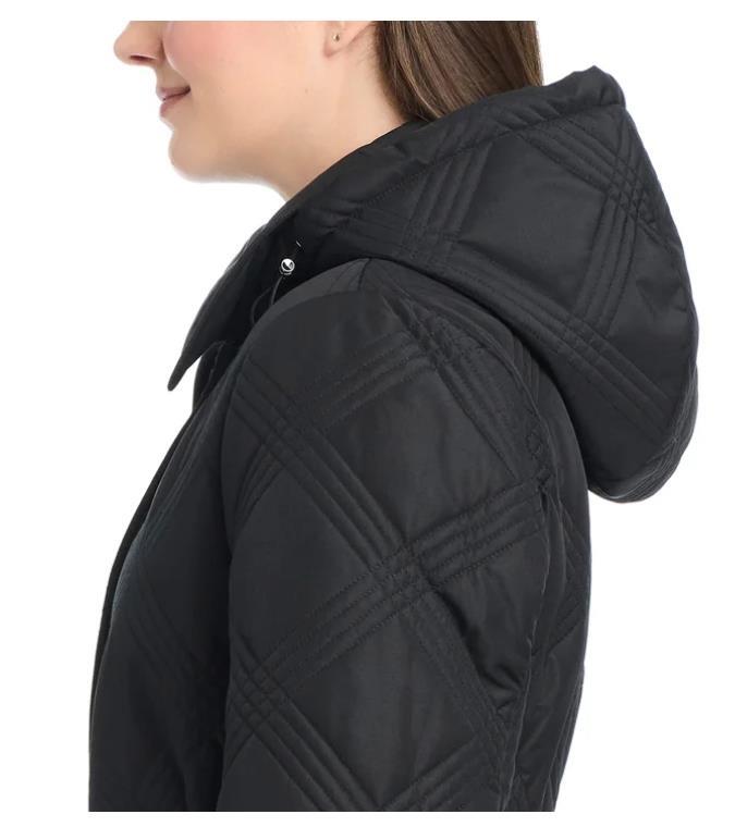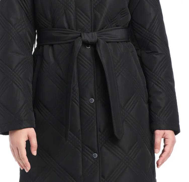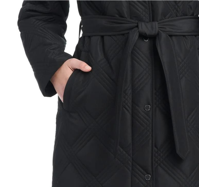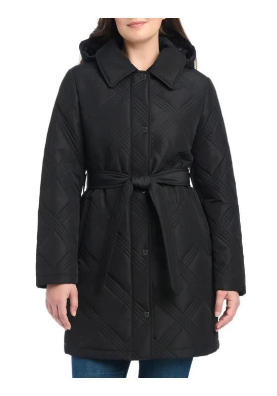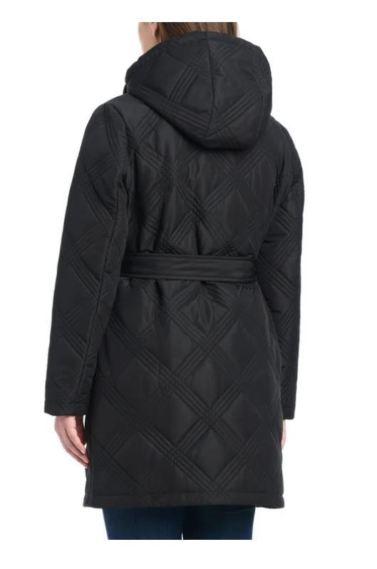- Jones New York Womens Jacket Black Quilt Hood Tie Belt Pockets Heavyweight
