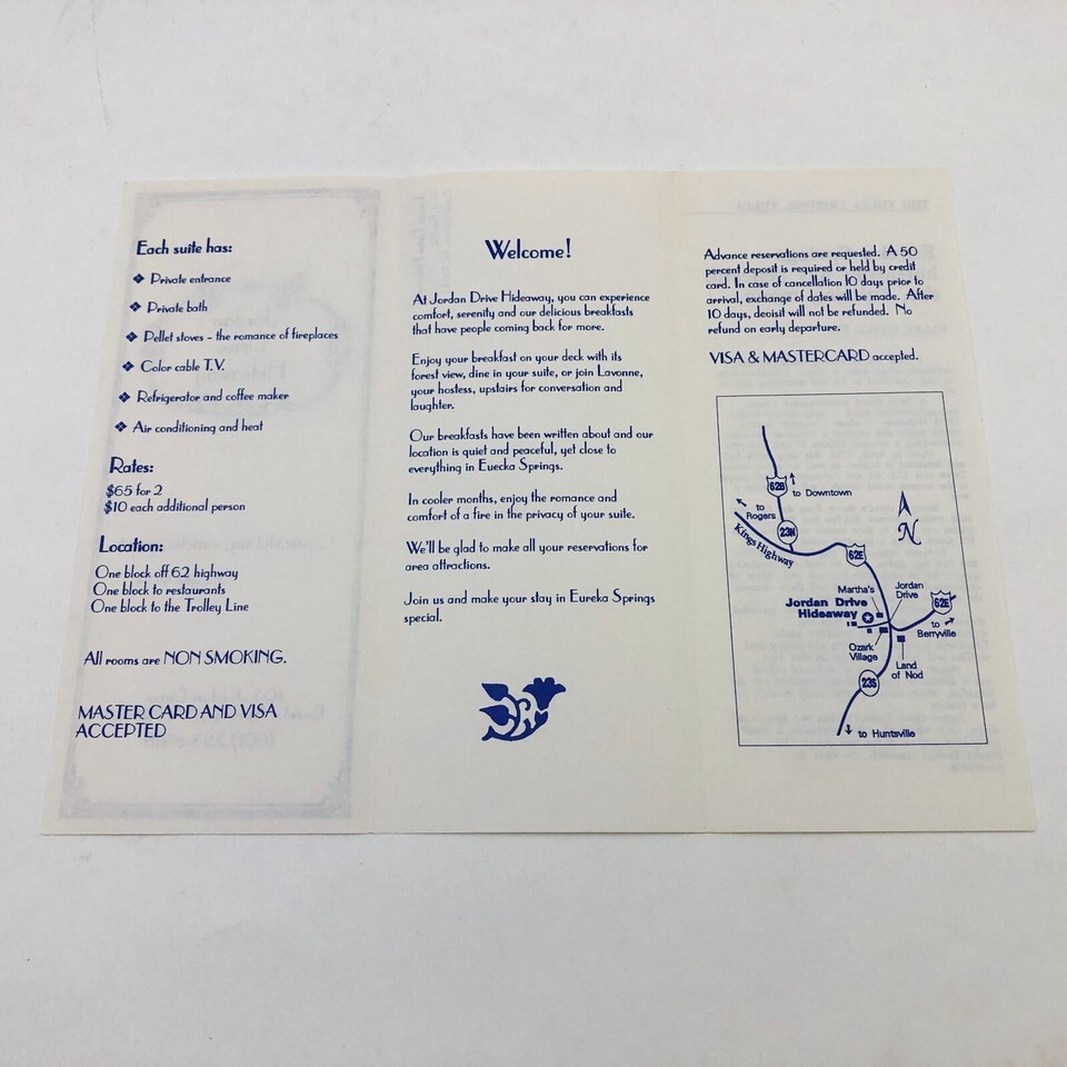 - Jordan Drive Hideaway Bed & Breakfast Brochure Eureka Springs Arkansas 1990's