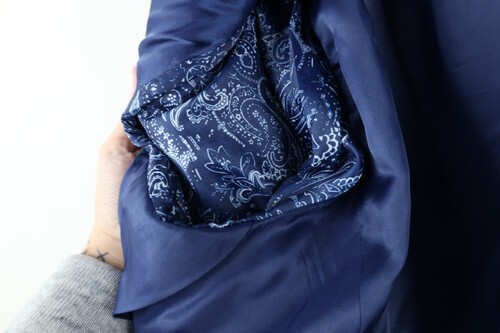 Stains/dark spots front. Collar, cuffs, inner lining discolored. Color faded. 19.5 inches shoulder to shoulder seam. 26.5 inches shoulder seam to cuff