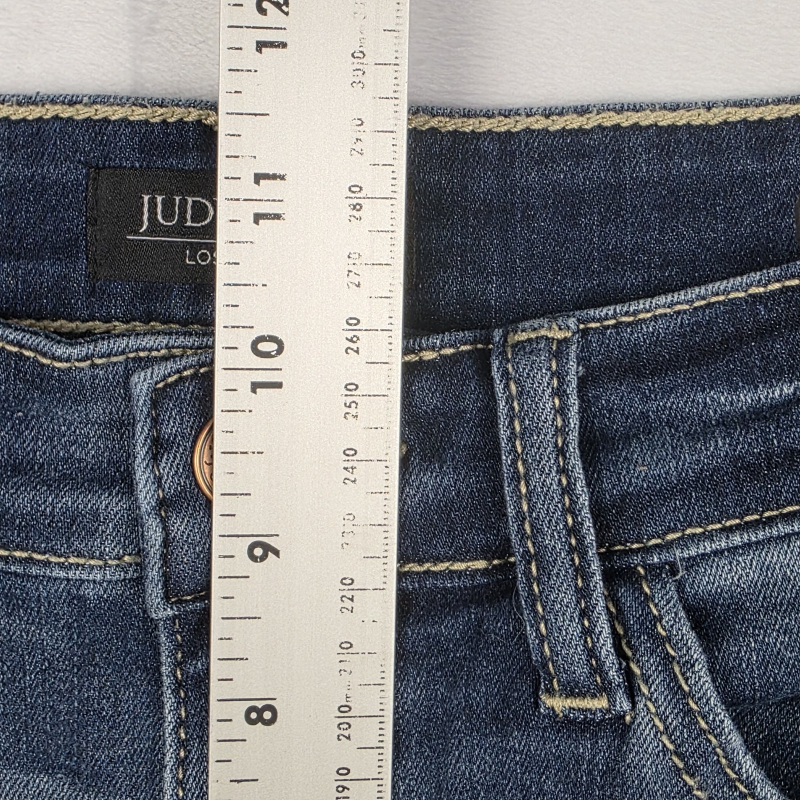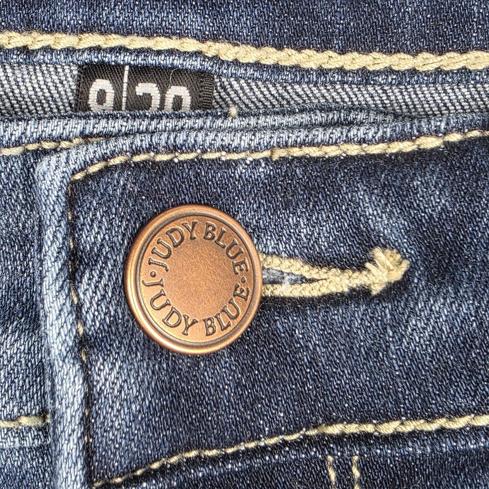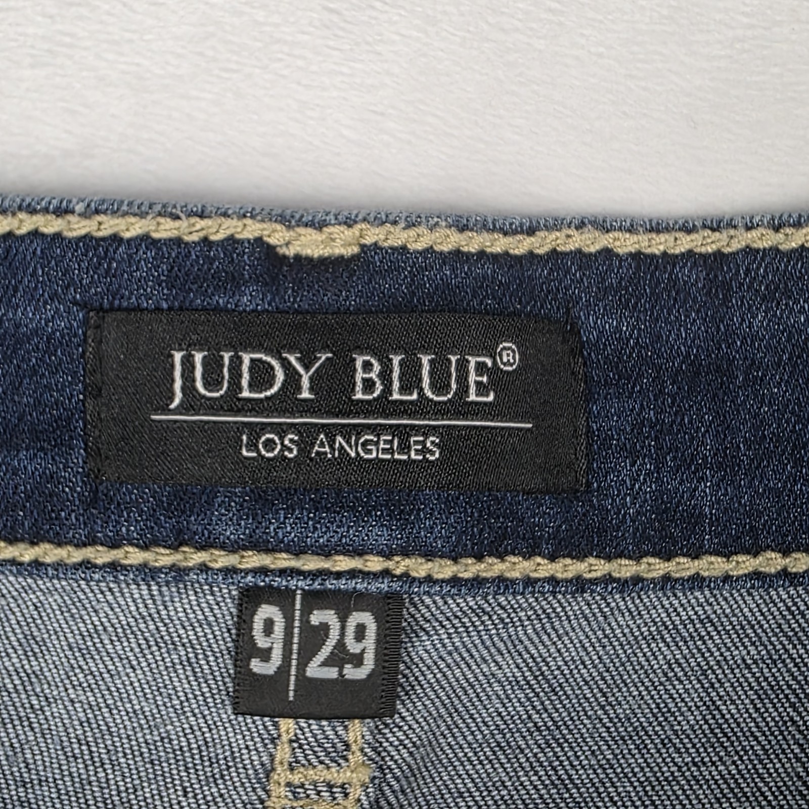 The product is a pair of Judy Blue jeans in a women's size 9/29. These skinny fit capri mid rise denim pants are in a classic solid blue color with a medium wash. Made from a blend of polyester, spandex, rayon, and cotton, these jeans feature a zip and button closure, along with a 5-pocket design and coin pocket. With a regular fit and 19-inch inseam, these jeans offer comfort, stretch, and are easy to care for, making them perfect for the summer, fall, and spring seasons.