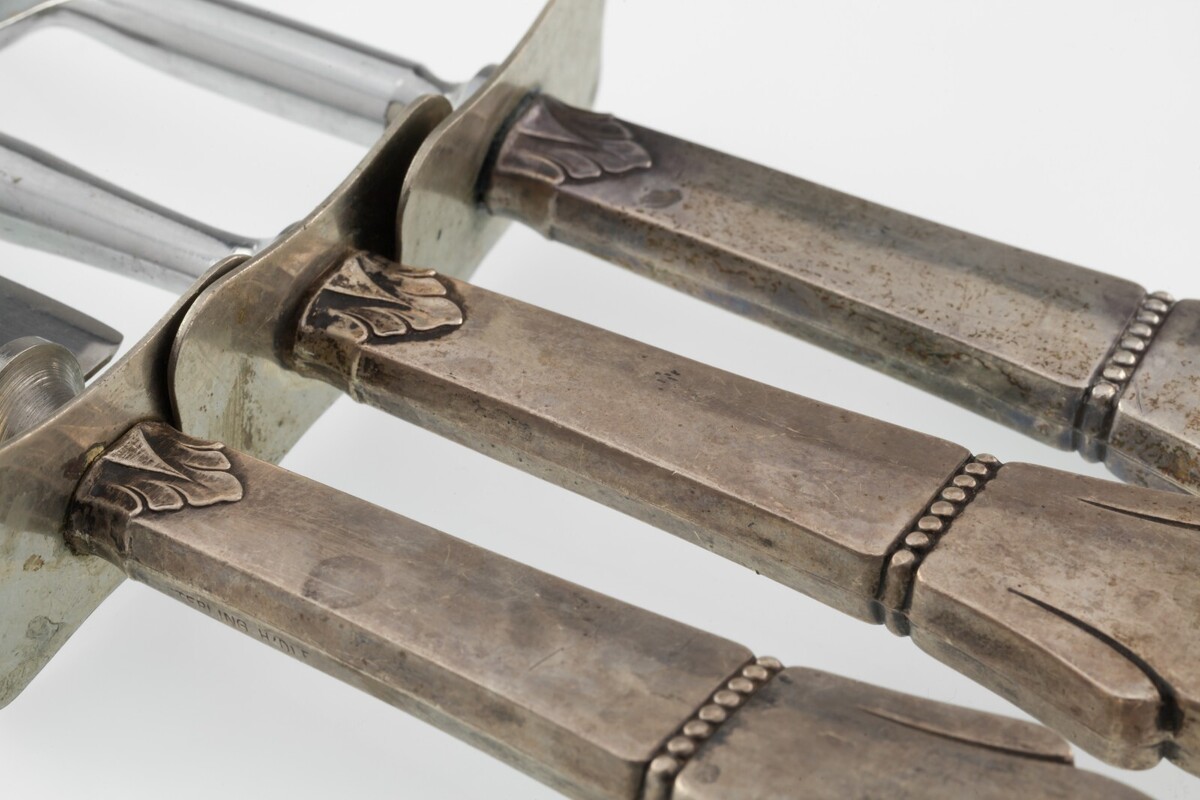 Tallado de plata esterlina con tenedor, cuchillo y afilador