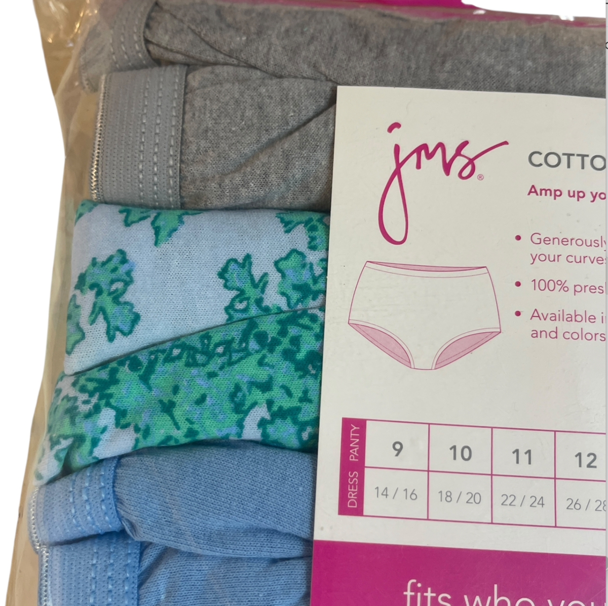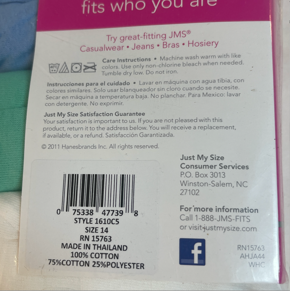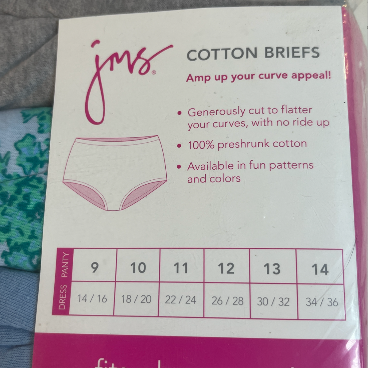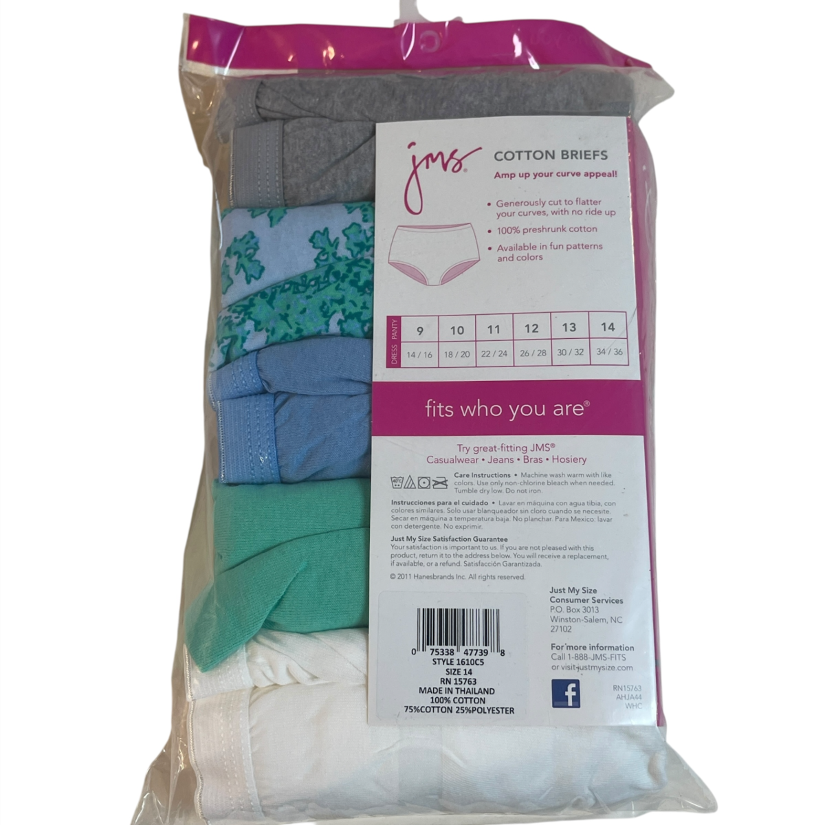 New old stock. 2011 Hanesbrands Inc. Includes 5 pairs of cotton underwear briefs panties. Size 14 or a 34/36 dress size. JMS fits who you are. Classic style with a generous, full cut and perfect in fit. 4 solid colors (1 green, 1 blue, 1 gray, 1 white) and 1 pair with a print. Please see all gallery photos. We are a smoke free, pet friendly home. Have a great day!