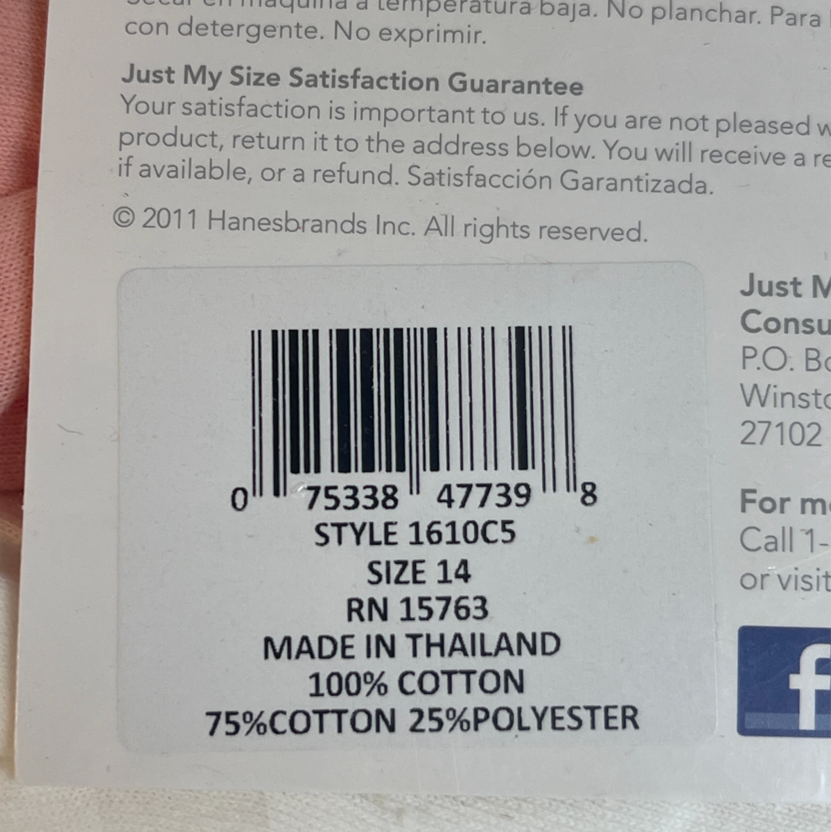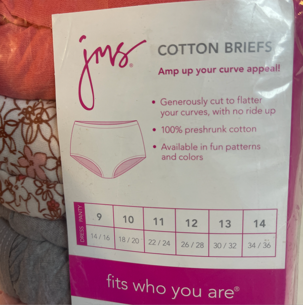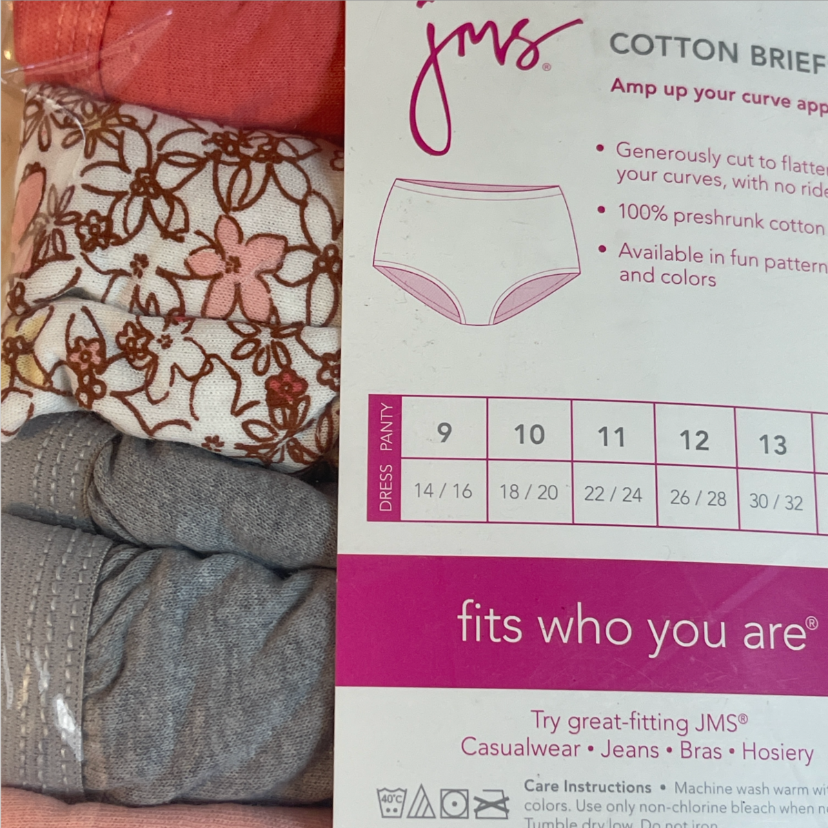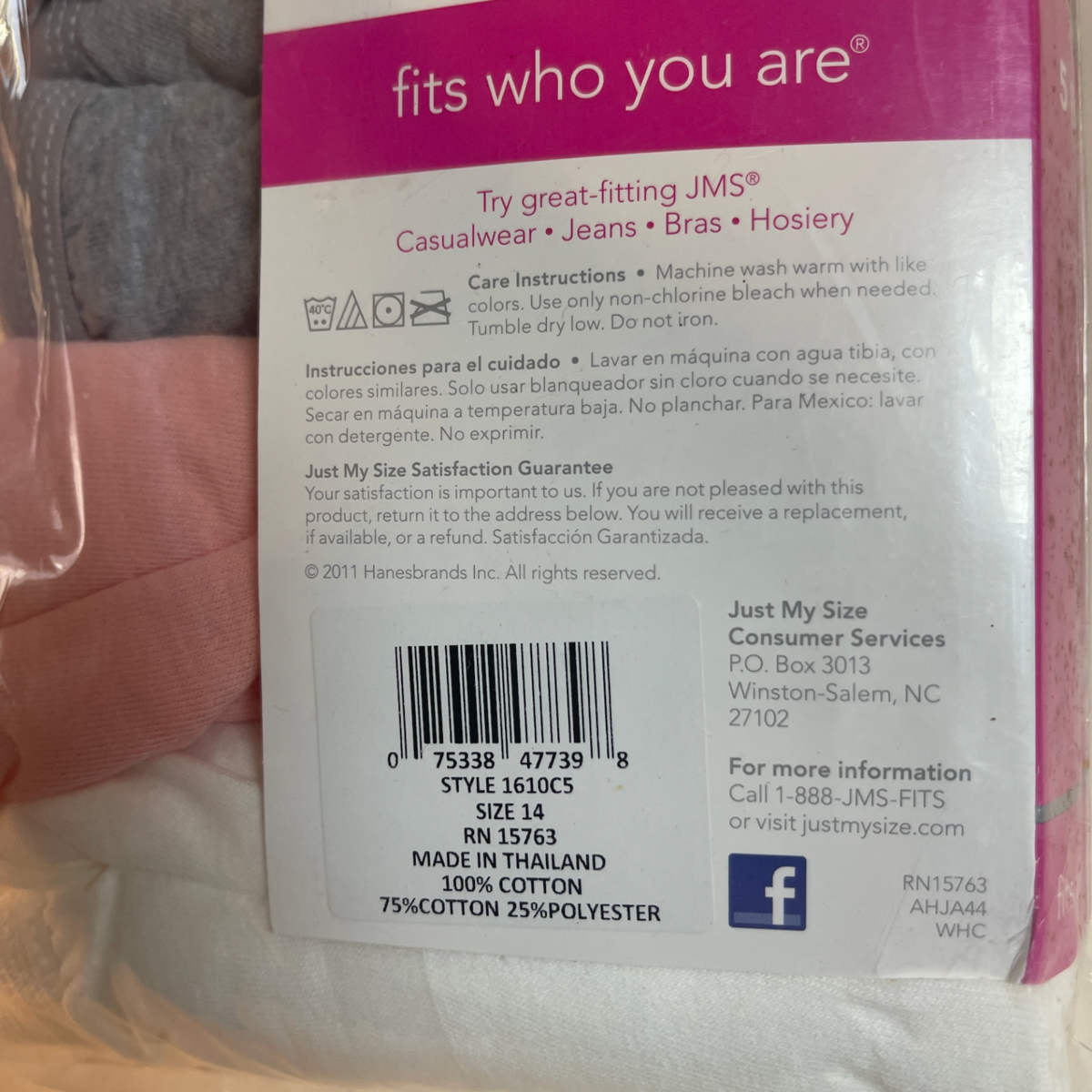 New old stock. 2011 Hanesbrands Inc. Includes 5 pairs of cotton underwear briefs panties. Size 14 or a 34/36 dress size. JMS fits who you are. Classic style with a generous, full cut and perfect in fit. 4 solid colors (1 coral, 1 peach/pink, 1 gray, 1 white) and 1 pair with a floral print. Please see all gallery photos. We are a smoke free, pet friendly home. Have a great day!