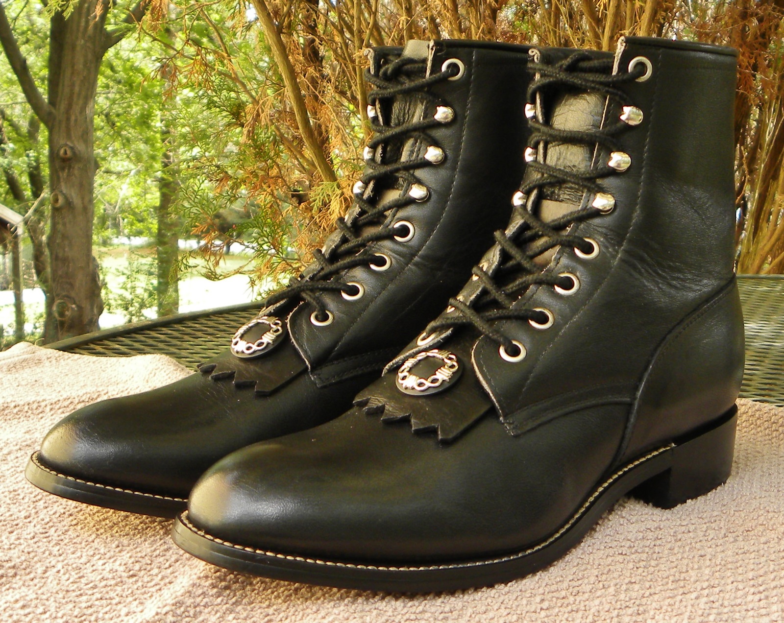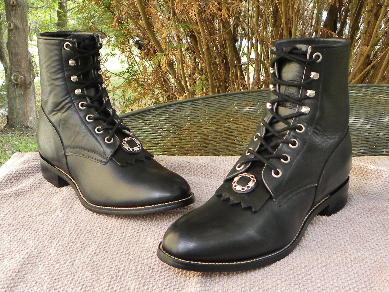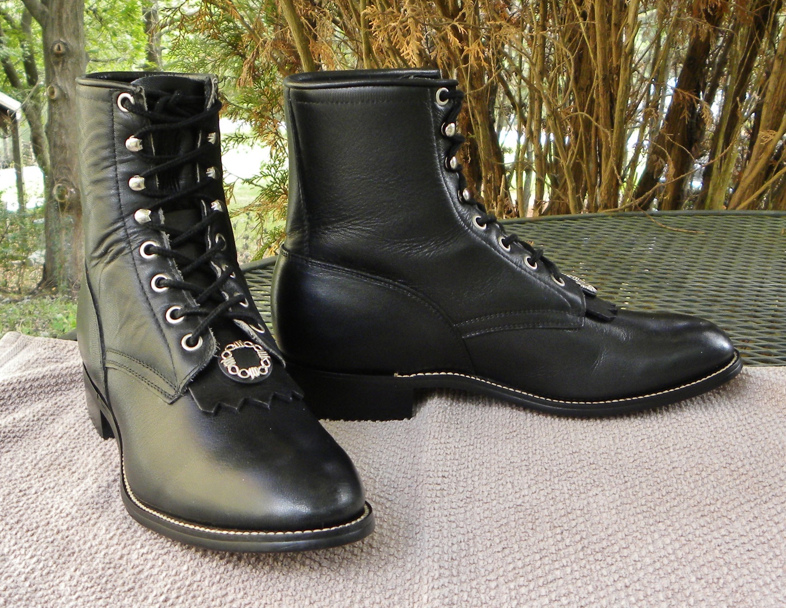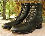 You are viewing a pair of preowned black Leather Paddock/ Jodhpur Boots by JUSTIN BOOT CO for Young Mens--size 5.5 or Approximately Young Woman's size 7.5, but please measure your foot or another pair of your boots with roper toes that fits well then refer ONLY to the measurements listed in this description. Justin Roper's run bigger. These Classic black lace up Justin Original Ropers (506Y) are leather, have 6.25" upper shafts, removeble Kilties with barbed wire CONCHOS, synthetic smooth bottom sole with a Justin logo heel cap on a low block sole, roper toes and light top stitching around the sole. These boots are some of the most popular Paddock Ropers on the planet. They have a serious, professional appearance that looks good all the time. Go to the barn or go to the show. SHARP Boots! Condition: There is wear on these boots consistent with minor use to include: very slight creasing across the top of the toe area, rubs scuffs. The bottom soles have minor wear except on the back edge of the heel. The inside leather lining looks good.. These leather boots have a nice sheen. PLEASE LOOK at all Photos so that you will know exactly what you are buying. OUTER Measurements: Length (along the side of the foot) ) Heel to Toe: 10.75"~ Across ball of the foot:3.5" ~ Heel height: 7/8"~ Shaft height from top of heel: 6.25".