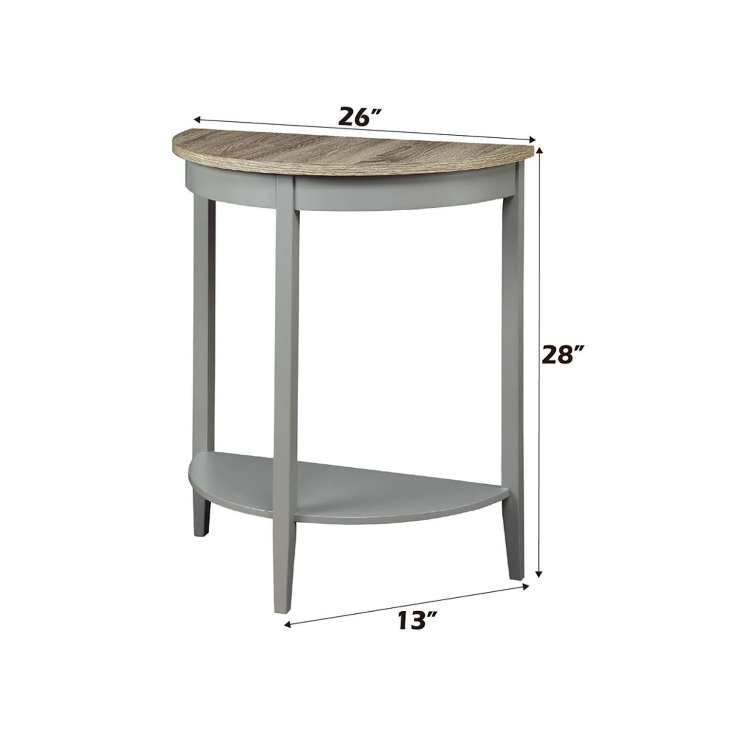 Features: Half Moon Console Table Open Compartment: Bottom Shelf (Open Back) Wooden Frame: Top Apron, MDF with Paper Veneer (Wood Grain Pattern) Wooden Square Leg: 3 Legs, Solid Pine Wood Clearance Between Top Shelf: 19" Height (480mm) Set Includes: One (1) Console Table
