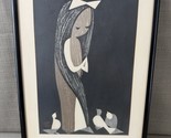 Depicts a young girl with long hair and a bow, surrounded by white doves in a minimalist, contemplative scene. Artist?s red seal visible in the lower left corner. Professionally framed and matted, measuring approximately 18? x 14?. The back retains a label from The Art Shop, Alhambra, California, indicating mid-century U.S. gallery distribution.