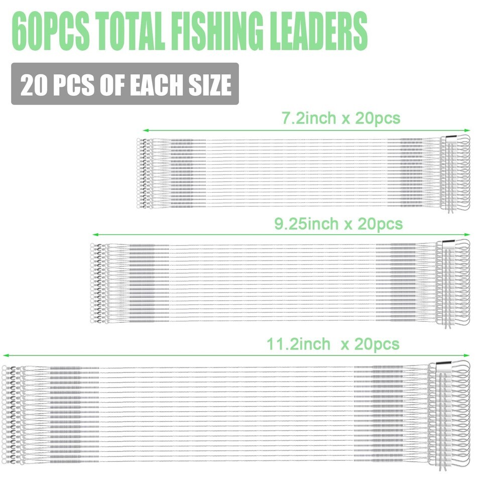 Package Content: You will receive 60pcs fishing leaders in 3 different sizes: 18.5cm / 7.3inch, 23.5cm / 9.25inch, 28.5cm / 11.2inch, 20pcs of each size. Sufficient quantity meet your fishing needs and you can choose different size according to your needs.