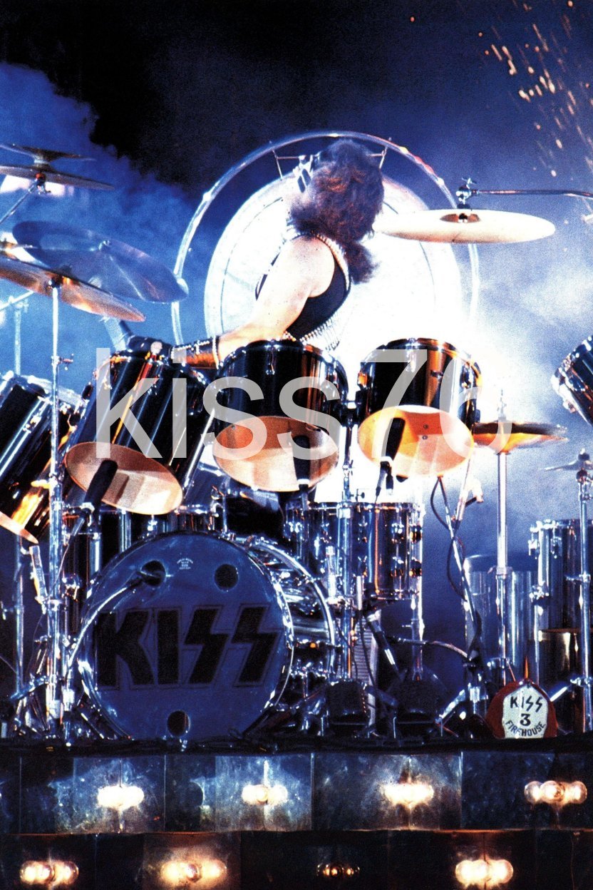 Peter Criss 24 x 36 inch custom poster. Live shot taken back in the day during the LOVE GUN / ALIVE II era. Awesome cool close up of him. The item is printed on premium HP glossy poster paper it will arrive in perfect condition rolled and bagged in a sturdy poster tube. If you've got a KISSROOM this is a must have!!