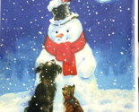Delightful image of a snowman in a red wool scarf chatting with a black dog and striped tabby. One red cardinal is perched on his black top hat and one is at his feet. The scene is in a snowy field under a blue night sky with falling snow.