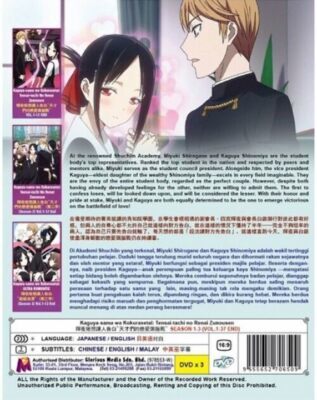 body { font-family: "Market Sans", Arial, sans-serif; } For detail of this set please view below only, and also to tell if this set has english or Japanese audio view below and check out the listing photo back side. If it shows as (Japanese / English Version means it has English audio but if it only shows Japanese Version no English Audio)All our set has at less English Subtitles if only Japanese audio. This set is all regions. KAGUYA-SAMA WA KOKURASETAI: TENSAI-TACHI NO RENAI ZUNOUSEN SEASON 1-3 DVD Title Name KAGUYA-SAMA WA KOKURASETAI: TENSAI-TACHI NO RENAI ZUNOUSEN SEASON 1-3 No of Disc 3 Disc (37 Episodes) Version English / Japanese Subtitles Chinese / English / Malay Format DVD / NTSC All Region Code (16:9) STORY : At the renowned Shuchiin Academy, Miyuki Shirogane and Kaguya Shinomiya are the student body's top representatives. Ranked the top student in the nation and respected by peers and mentors alike, Miyuki serves as the student council president. Alongside him, the vice president Kaguya?eldest daughter of the wealthy Shinomiya family?excels in every field imaginable. They are the envy of the entire student body, regarded as the perfect couple.However, despite both having already developed feelings for the other, neither are willing to admit them. The first to confess loses, will be looked down upon, and will be considered the lesser. With their honor and pride at stake, Miyuki and Kaguya are both equally determined to be the one to emerge victorious on the battlefield of love! We Only Sell Original/Genuine DVDs. All DVDs I'm selling are from Licensed Publisher in Malaysia. All DVDs come with Original Sealed Authenticated Sticker / Hologram by Malaysia Censorship Board. ALL PACKAGE WILL BE SHIP OUT FROM USA CA SAN DIEGO AREA OCEANSIDE, SAN MARCOS. THIS MEAN WITH IN USA YOU SHOULD RECEIVE THE PACKAGE WITH IN 4-6 BUSINESS DAY AFTER SHIP OUT. We Only Sell Original/Genuine DVDs. All DVDs I'm selling are from Licensed Publisher in Malaysia. All our products are All region so it will play any dvd player in the world Any problem please contact us first so we can speed up taking care of you.