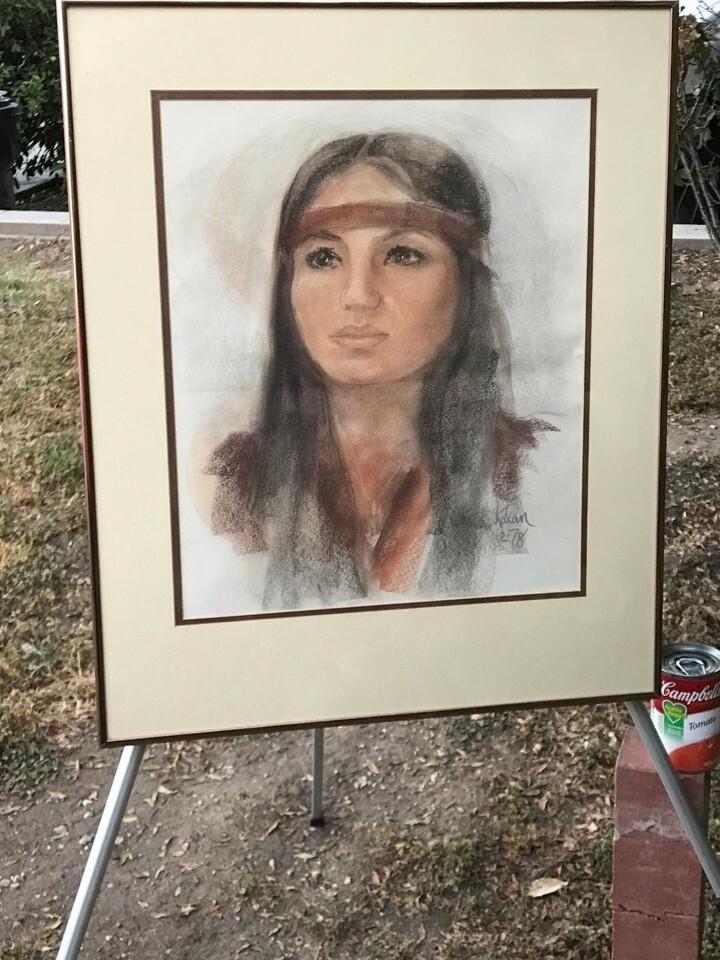 She continued her art studies in LA and worked a part-time job selling sandwiches for the Screen Actors Guild. A customer told her one day in 1977 that the Olvera Street sketch artist might need a helper, and she landed the job. In 1980, Olvera Street officials had Kalan paint a portrait of Mrs. Sepulveda of the pioneer Sepulveda family, who was visiting the office that day. They liked what they saw, and she set up shop in the 4 by 6 foot vine-shaded porch that served as her studio until early 2000's.