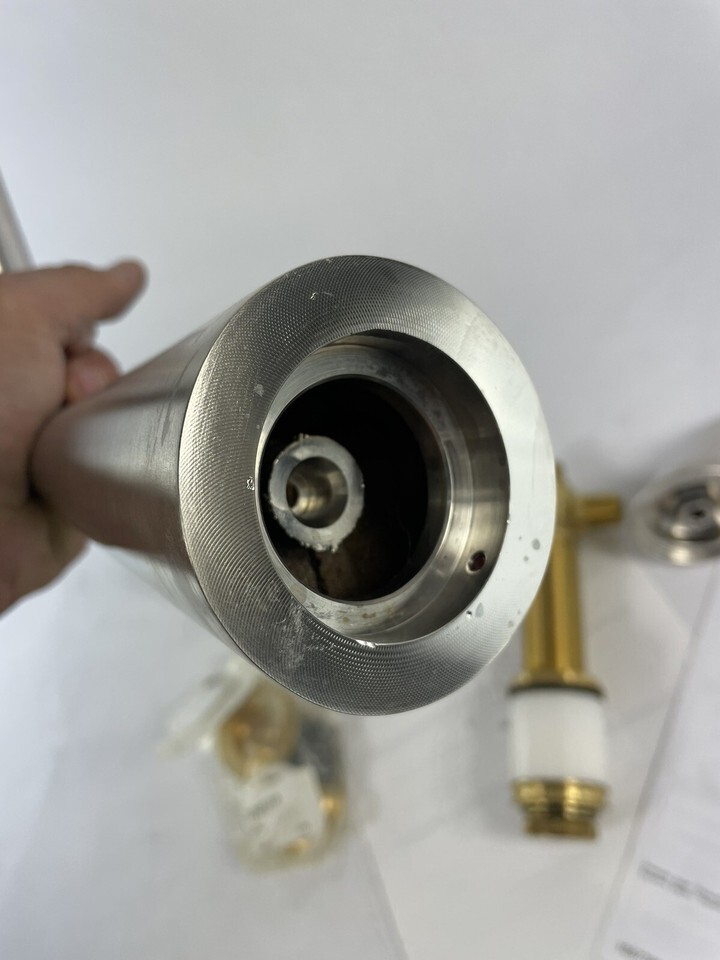 Kallista Taper Deck Mounted Roman Tub Filler Brushed Nickel P24803-LV-AG, NEW MSRP : $2126.50 Specifications: ---Height: 8-7/16" (bottom to top of faucet) ---Spout Height: 7-3/16" (deck to spout outlet) ---Spout Reach: 8" (center of faucet body to center of spout outlet horizontally) ---Faucet Holes: 3 (minimum number of holes required for installation) ---Faucet Centers: 8" (center-to-center distance between handle installation holes)
