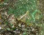 Minute yellow needles of kamotoite-(Y) on malachite from it's type locality. An unusual form for the species, from the personal collection of Ralph Merrill, the proprietor of Minerals Unlimited from the 1940's until his passing in 2001.
