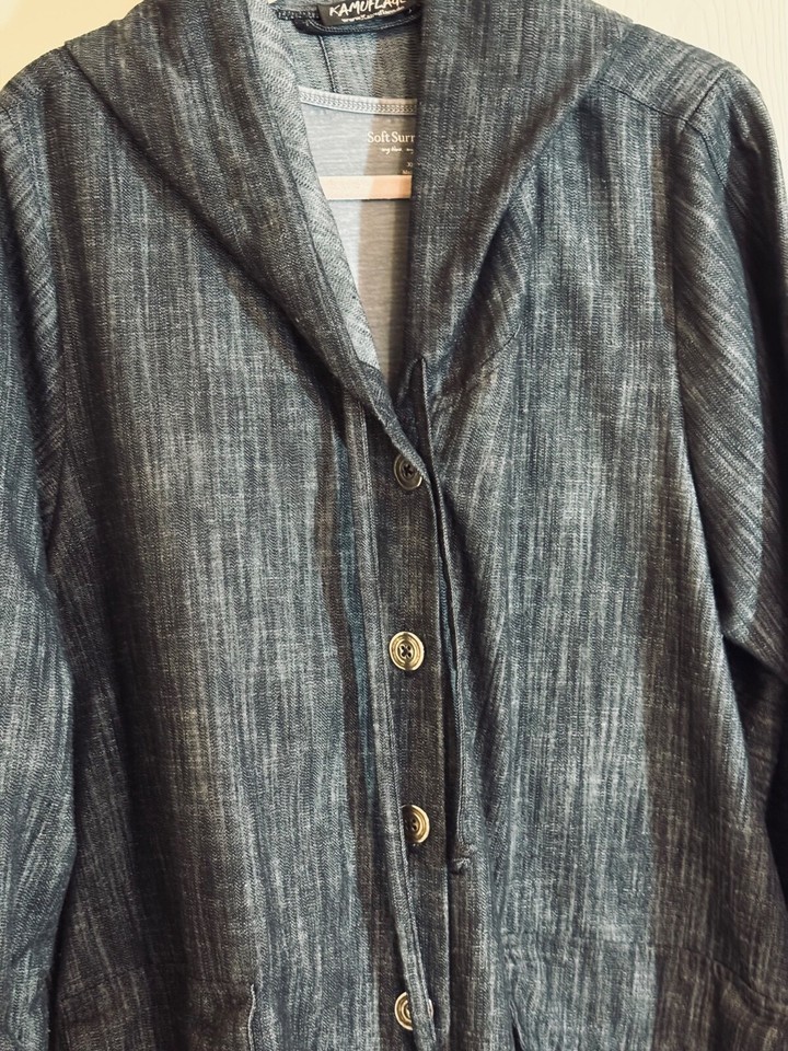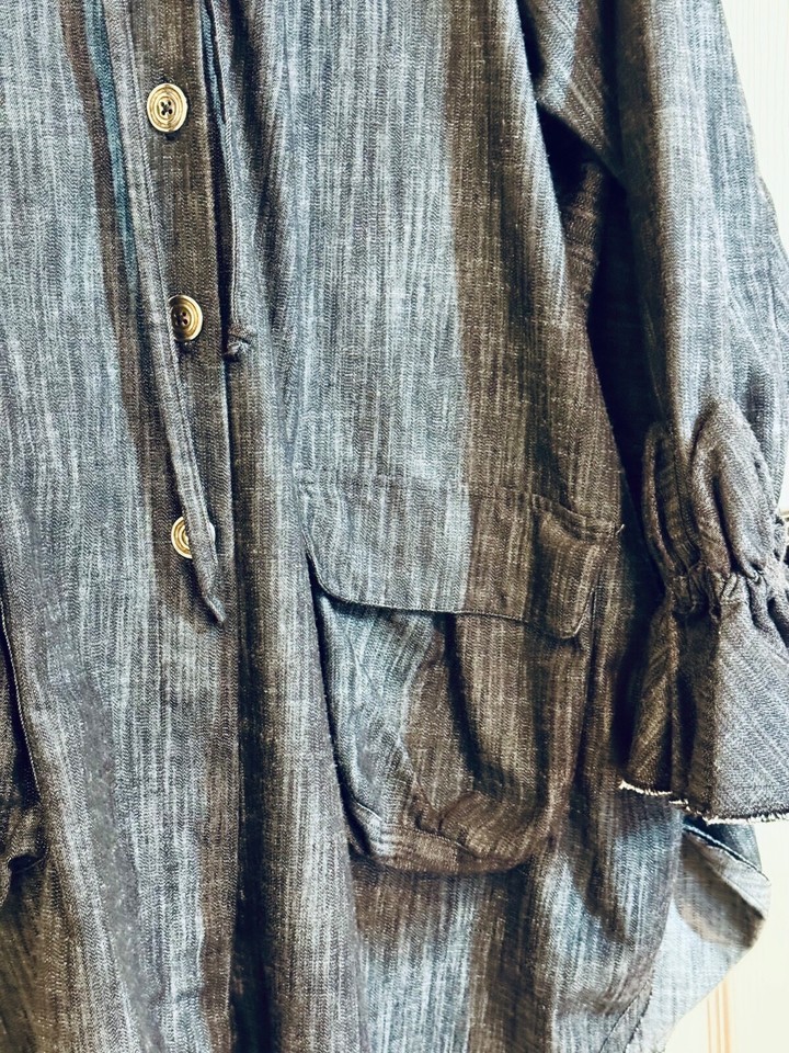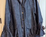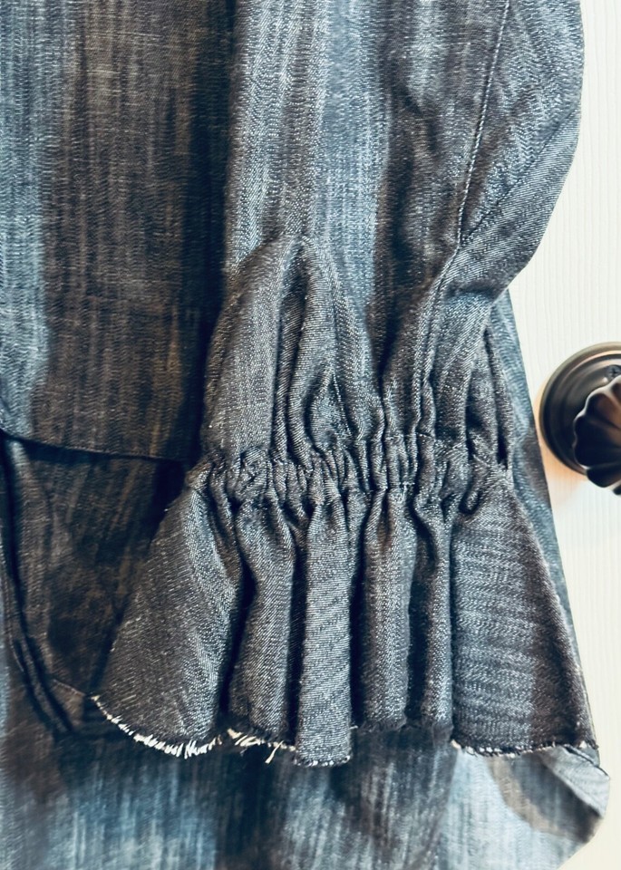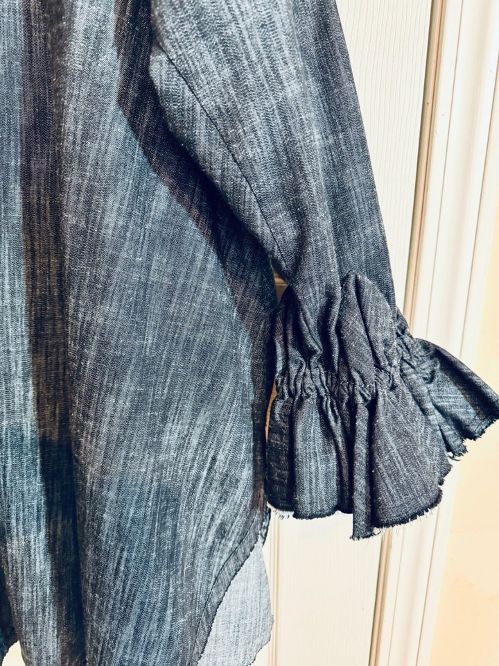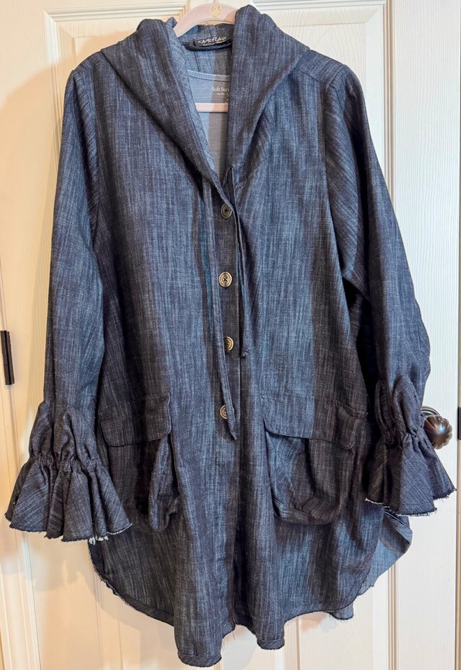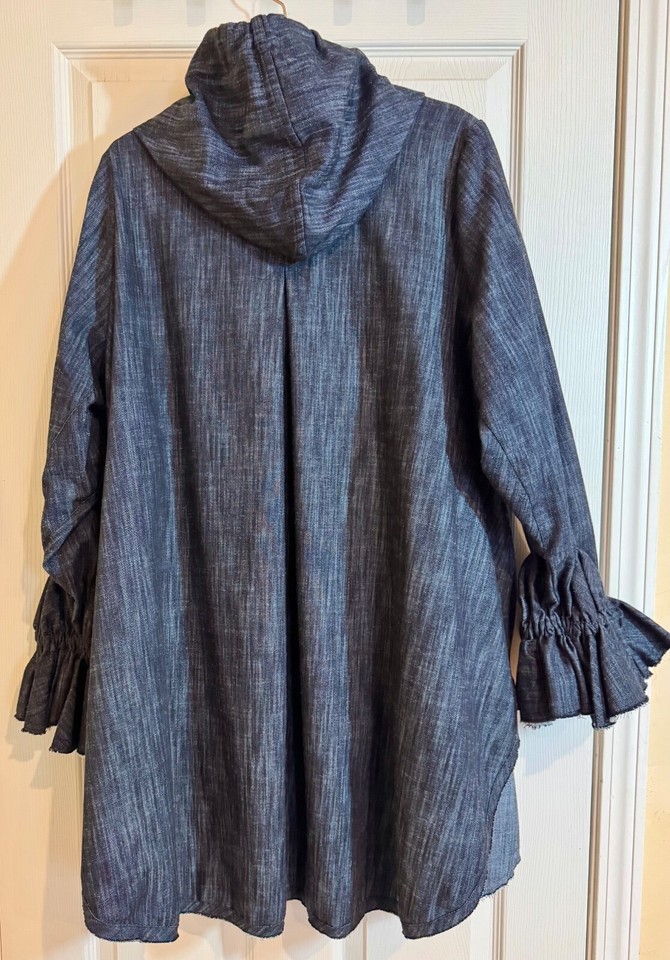 Avant guard hoodie is art to wear! Denim is light weight and comfortable. Button Front with two front pockets with flaps and ruffled sleeves for an artsy look.