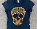 Karani Art Shirt Women's Large Aztec Skull Floral Blue Short Sleeve Cotton