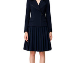 Our inspired version is crafted with high-quality 95% polyester and 5% spandex material, the set includes a long-sleeved jacket with an off-centre zip, club collar, and flap pockets. The flared mini skirt boasts wide knife pleats and side zip closure. Fully lined for maximum comfort and style.