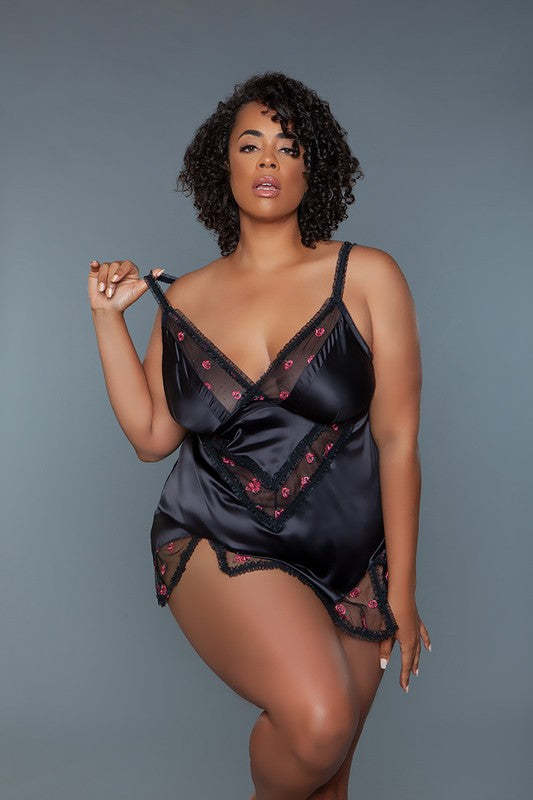 A satin babydoll with floral mesh embroidery and ruffled trim is an exquisite piece of lingerie that combines luxurious materials with intricate detailing for a romantic and feminine look. The main body of the babydoll is made from satin that drapes elegantly over the body, offering a sensual feel and appearance.