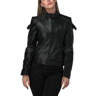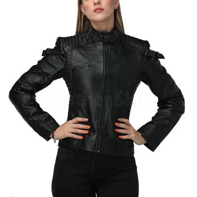 We at Leather Skin Shop introduce you to our Women Black Leather Jacket with the side stitched panel. Soft to touch and snug to fit, we say you wear the jacket to leave the crowd breathless with your celeb-worthy attire.